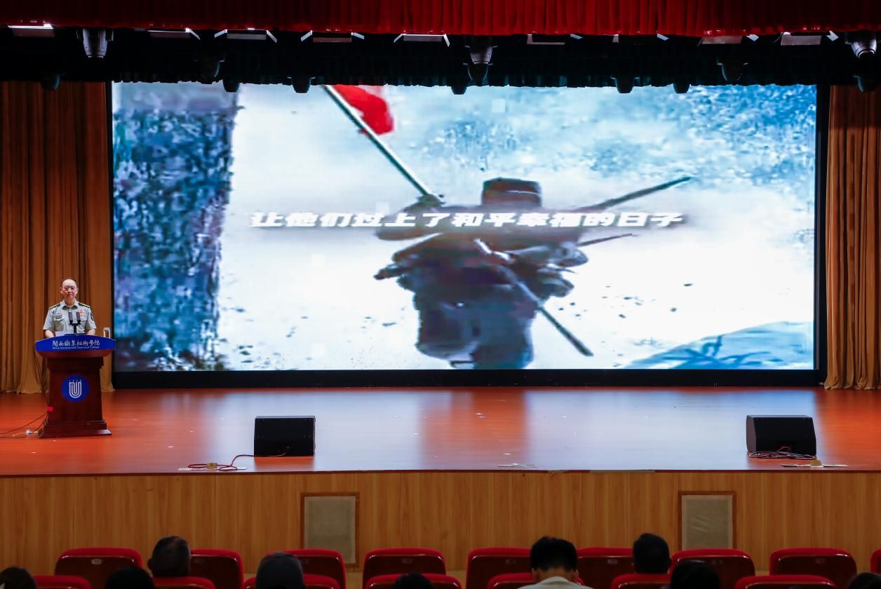 王战平大校从“永不偏移的信仰坐标——从北上抗日的铿锵誓言中,感悟忠贞不渝的民族大义”“万众一心的团结力量——从军民一心的风雨同行中,感悟众志成城的磅礴伟力”“舍我其谁的责任担当——从血战到底的壮烈抉择中,感悟视死如归的英雄气概”“静默流淌的无声大爱——从毁家纾难的倾力奉献中,感悟无私无我的家国情怀”四个部分,以闽西苏区北上抗日先遣队为切入点,通过珍贵历史影像与口述史料,再现了80年前红军将士听党指挥、向死而生的忠诚信仰。通过展示龙岩老区群众毁家纾难支援前线的实物照片,生动诠释了军民鱼水情的深刻内涵。王战平的讲述让大家深刻读懂了“保山河无恙”的使命担当,更明白了“吾辈自强”的时代意义。他希望师生们能将此份感悟融入日常,以先辈为榜样,把个人理想与民族复兴紧密相连,用实际行动践行“强国有我”的誓言。此次兼具历史厚度与现实温度的分享,为大家上了一堂生动又深刻的国防教育课、历史课、人生课。整场公开课内容丰富、图文并茂、感动感人、触及灵魂。