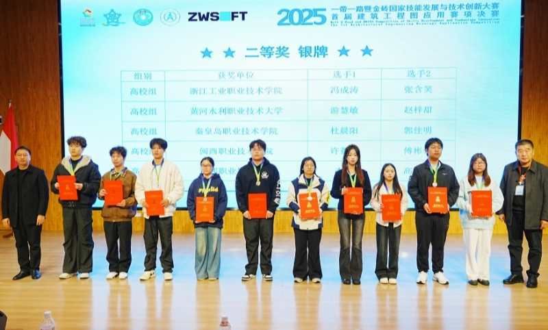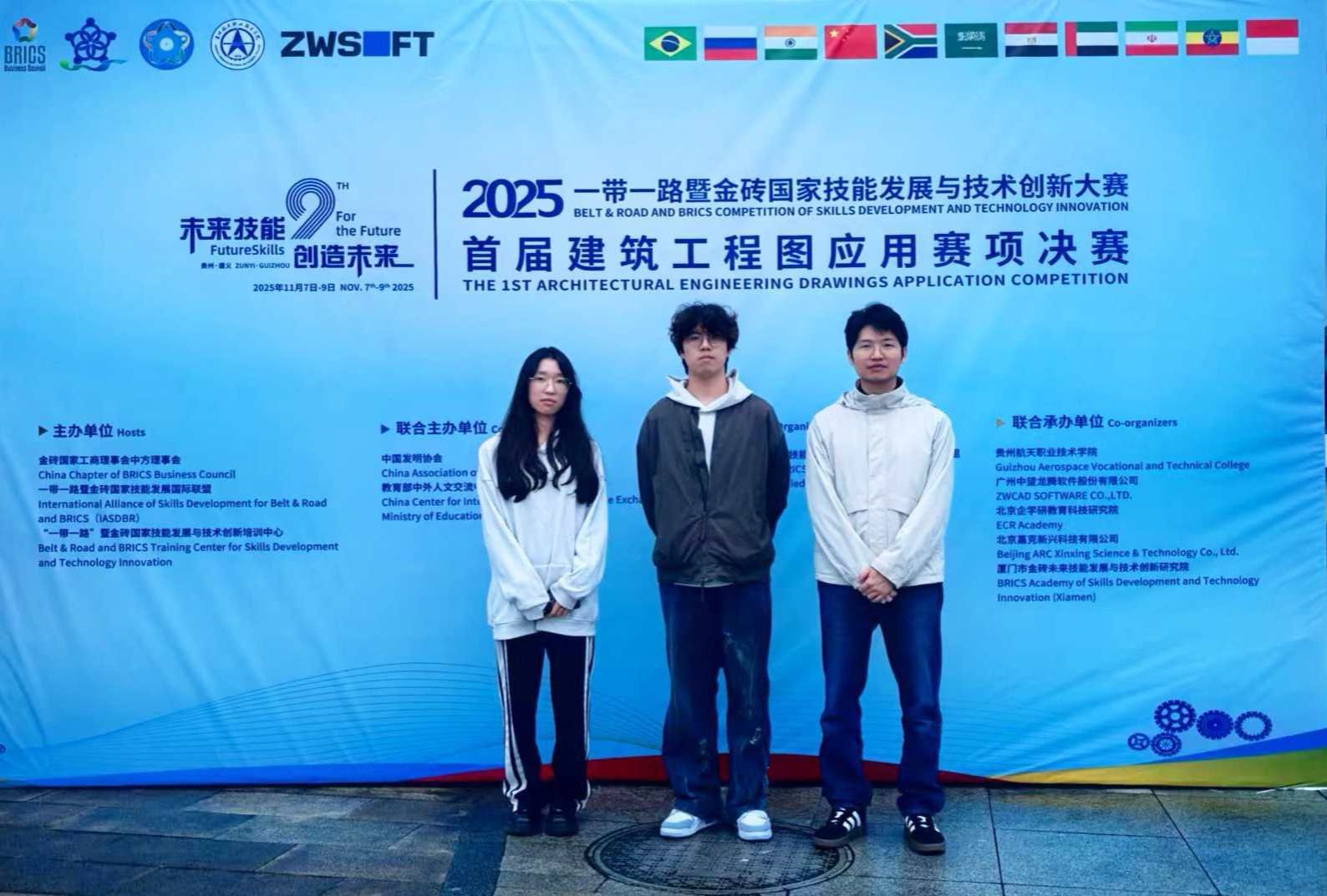 11月9日,2025“一带一路”暨金砖国家技能发展与技术创新大赛——首届建筑工程图应用赛项决赛在贵州航天职业技术学院闭幕。由温瑞彬、廖沐莹老师指导的团队(参赛选手:傅彬豪、许薏渲)荣获全国二等奖。