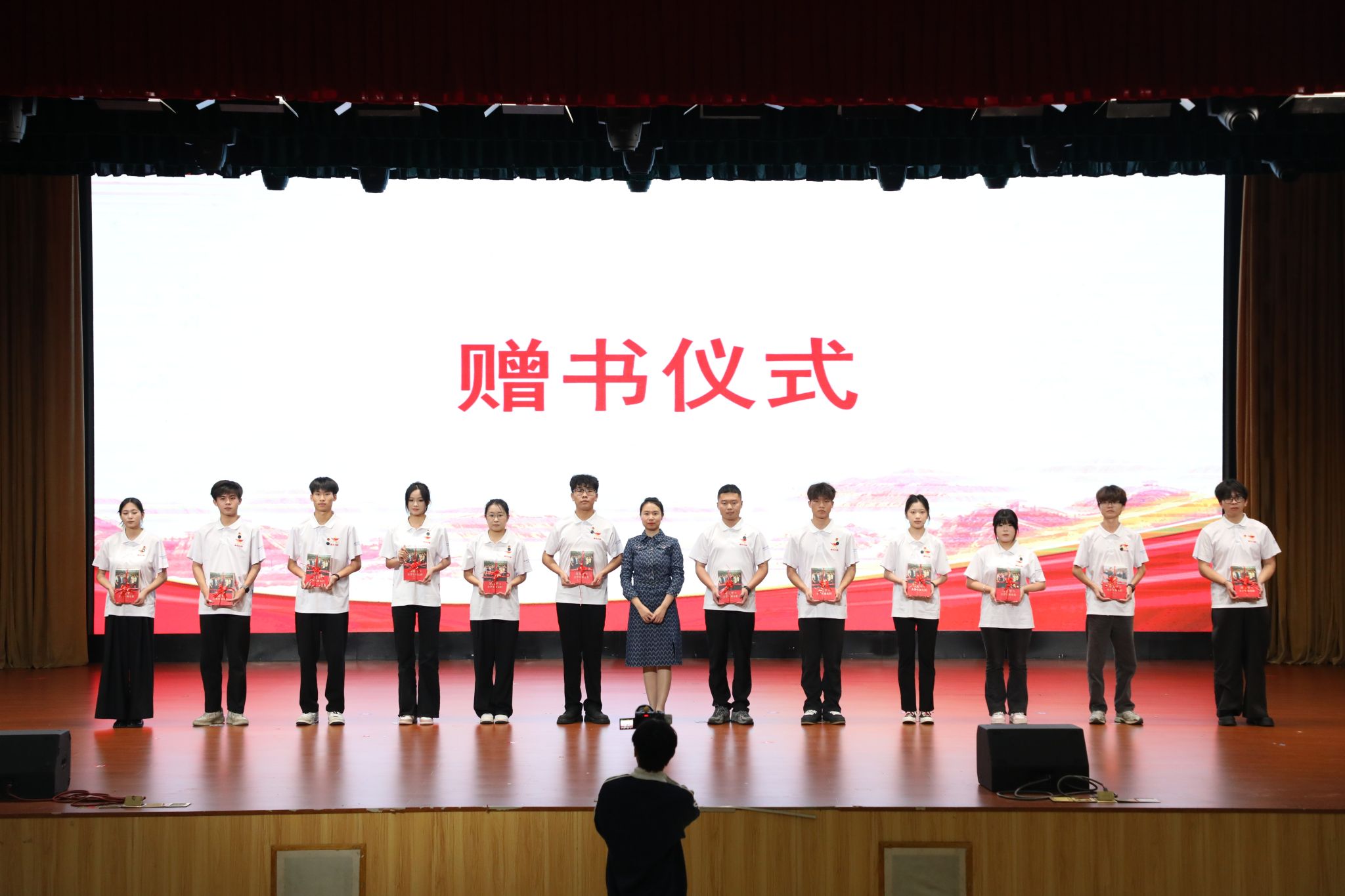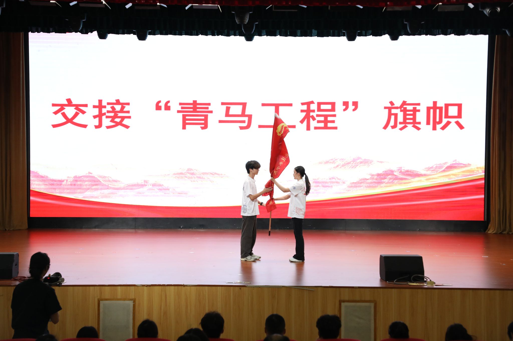 在热烈的掌声中,连玲娜副校长为2024-2025学年“青马工程”优秀学员颁发了荣誉证书。校团委负责人为2024-2025学年青马班学员赠送书籍《习近平与大学生朋友们》第一卷、第二卷。财经商贸学院蔡湘湘、谢喆喆分别代表新老学员上台发言,并交接“青马工程”旗帜。