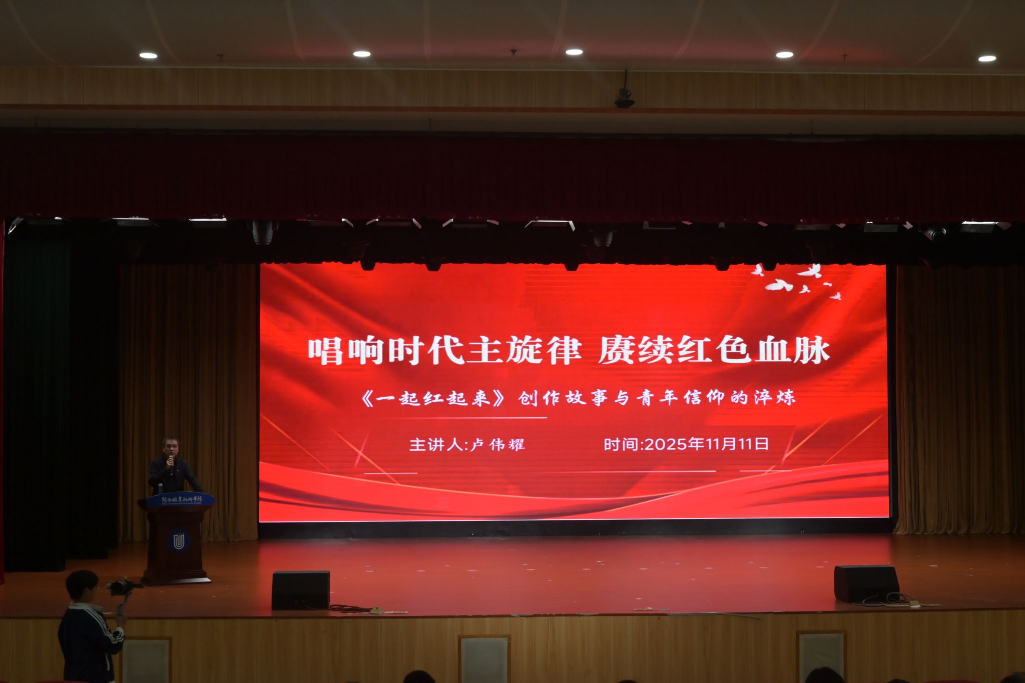 仪式结束后,校党委书记卢伟耀以《唱响时代主旋律 赓续红色血脉》为题为新学员上专题思政课。卢伟耀书记结合原创红色歌曲《一起红起来》的创作来源和创作心得,引导学员们将个人理想融入国家发展大局,在实践与学习中不断淬炼信仰,让青春在为祖国、为人民的奉献中焕发出绚丽光彩。