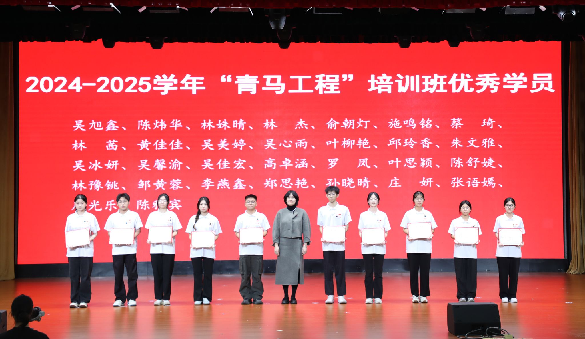 在雄壮的国歌中,开班仪式正式拉开帷幕。校团委负责人首先对2024-2025学年“青马工程”培训班的培训成果进行了全面回顾与总结。她肯定了过去一年学员们在理论学习、实践锻炼等方面取得的进步,并宣读了《2024-2025学年“青马工程”大学生骨干培训班优秀学员名单》,对表现突出的学员予以表扬。