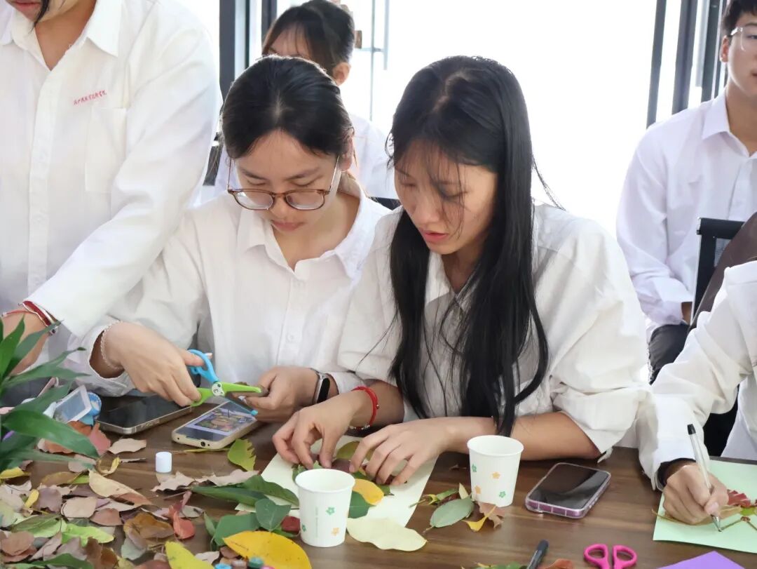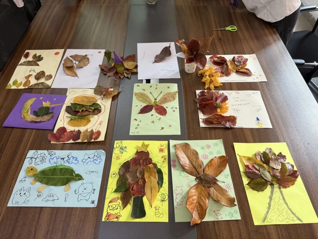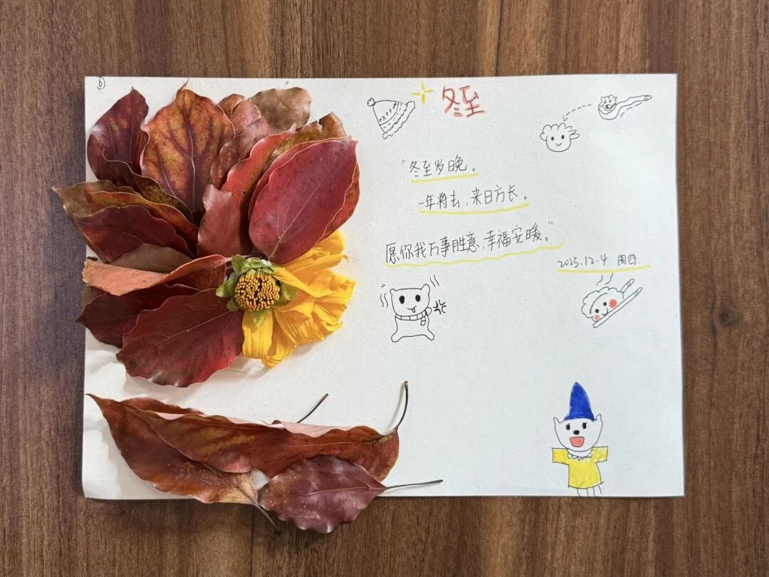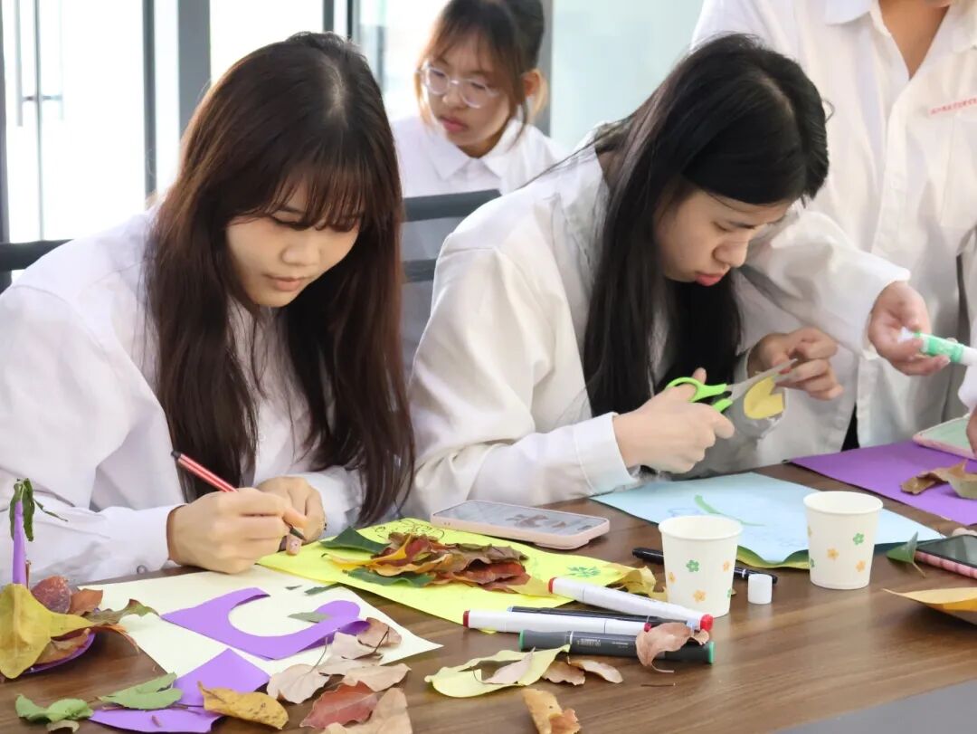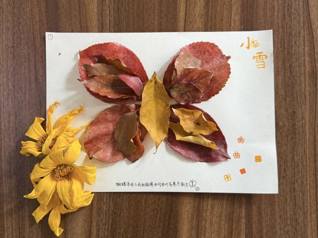 “冬日漫笔”主题落叶创意制作环节将活动推向了高潮。同学们充分发挥自己的想象力和创造力,将对小雪时节的深刻体悟巧妙地融入到落叶的形态设计与拼贴构思之中。每一片落叶、每一处拼贴,都承载着小雪的韵味与自然之美,让传统文化以一种全新的、艺术的形式得以呈现。