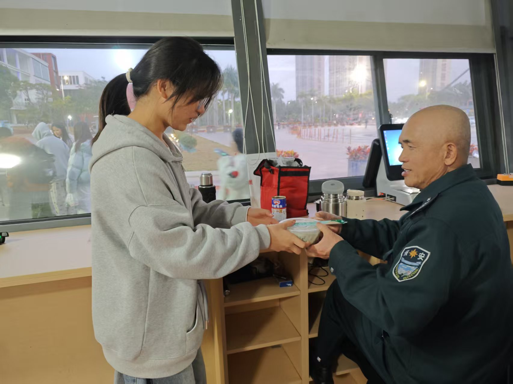 温暖不止于体验,更在于传递。“易”家人一同将精心打包的饺子,送至宿舍区值班门岗、安保人员等一线工作者手中,把活动的温暖延伸到校园的每个角落,用实际行动践行感恩教育,让这份冬日暖意传递给更多人。