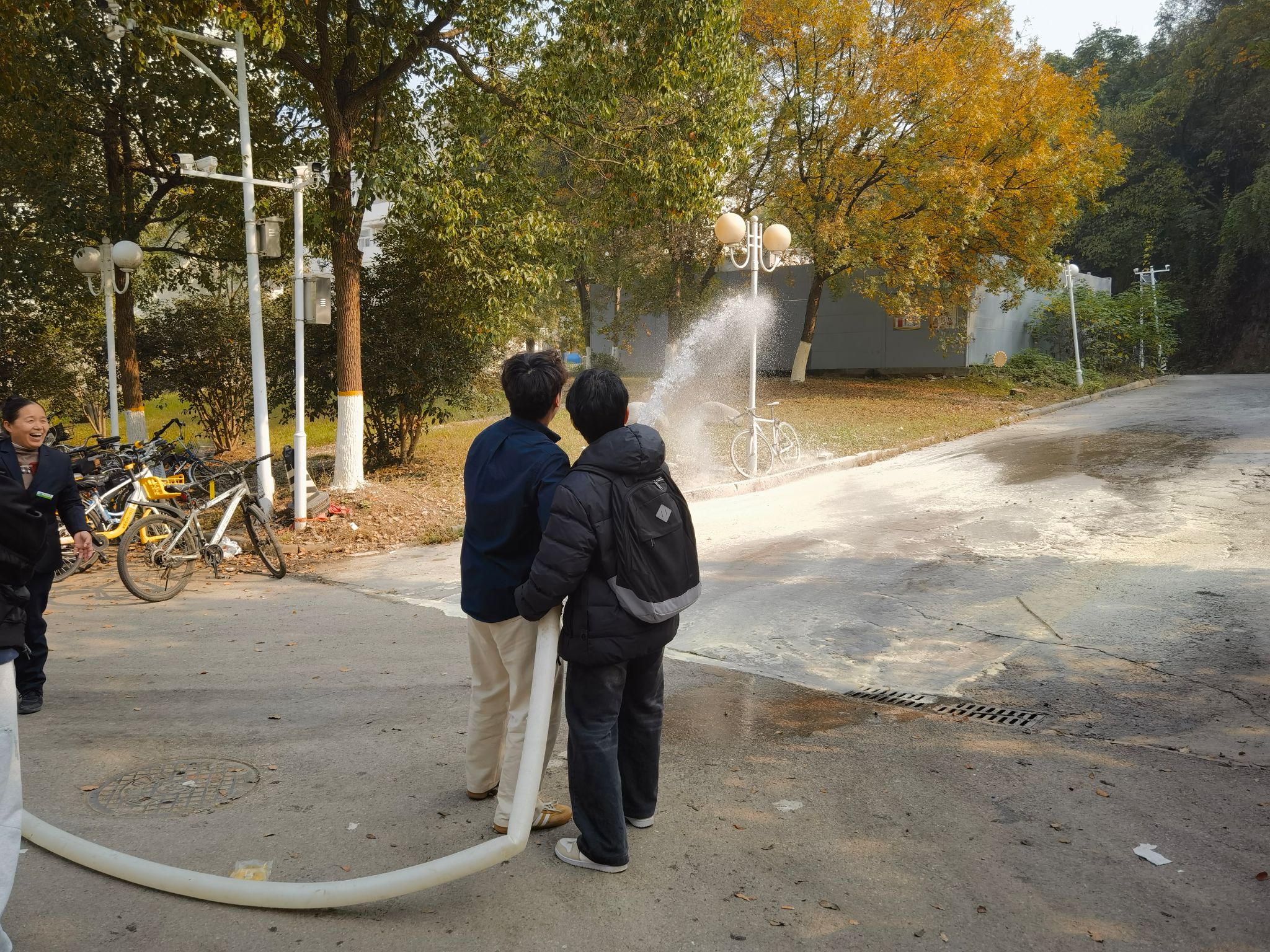 活动现场设置了安全教育主题展区,通过宣传展板、安全手册等形式普及消防与防护知识。保卫处孙浩老师现场演示灭火器的正确使用方法,并指导学生进行实操演练。在消防体验环节,同学们轮流操作校园小型消防车,亲身体验接水管灭火的全过程,在实践中学以致用。