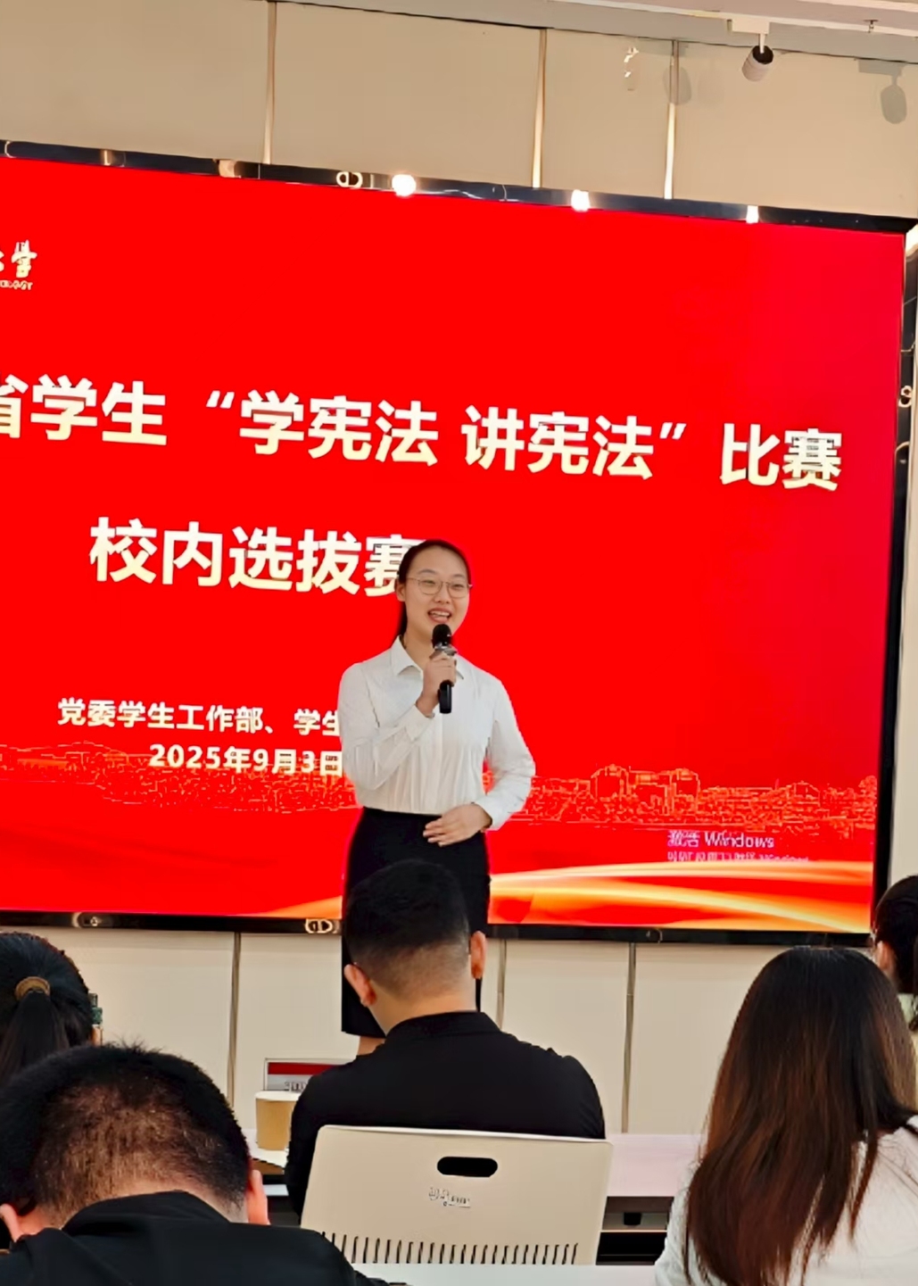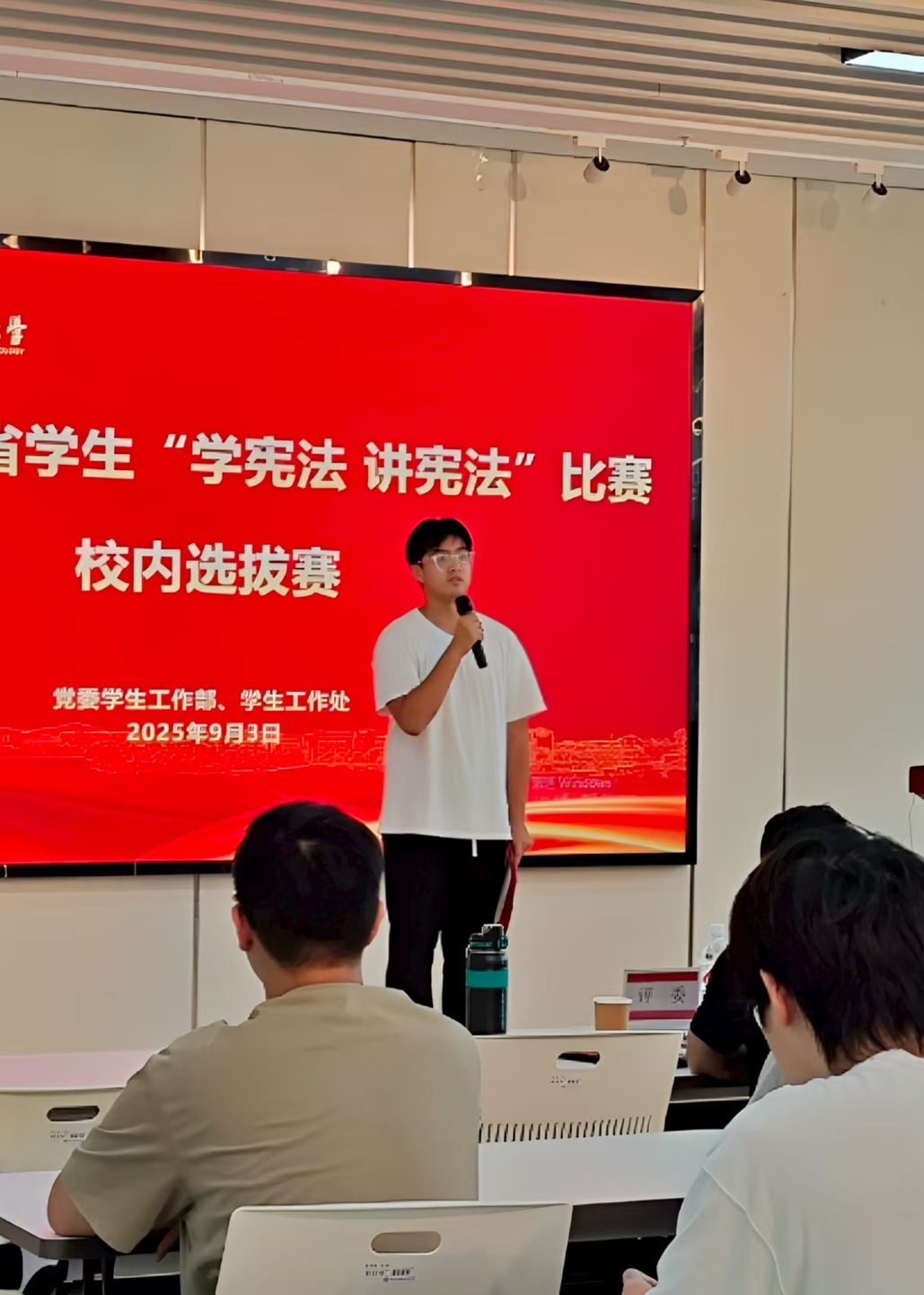 为深入学习贯彻习近平法治思想,大力弘扬宪法精神,切实增强我校学生的宪法意识和法治观念,9月3日下午,由学生工作处主办的全省“学宪法 讲宪法”比赛校内选拔赛,在我校大学生创新发展中心卡魅实验室圆满举行。