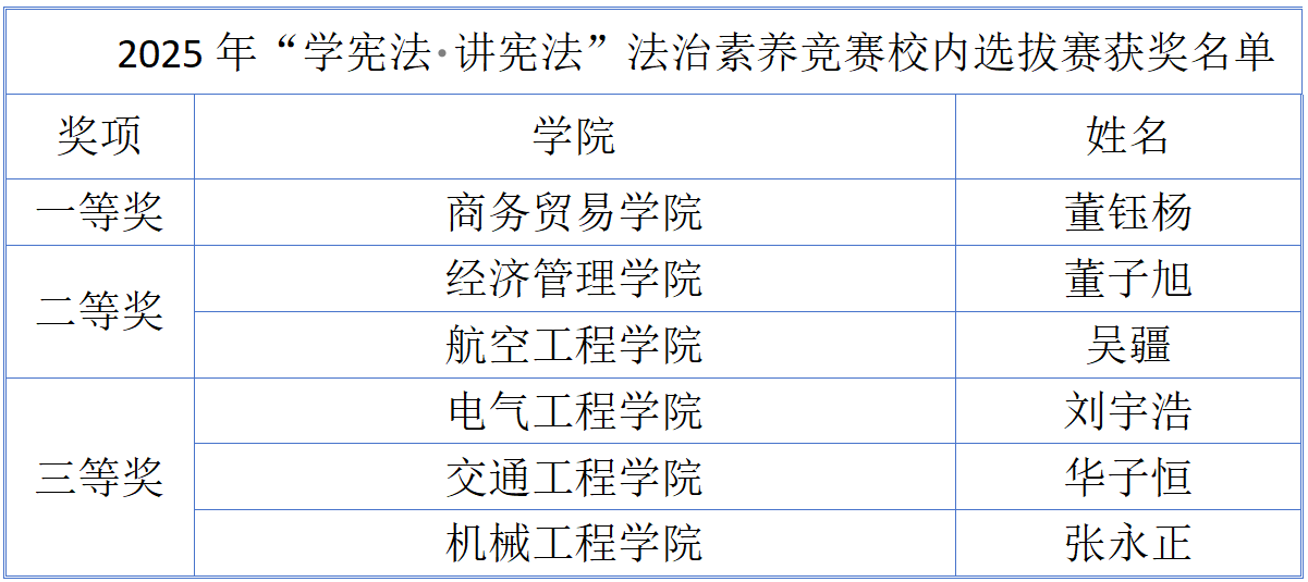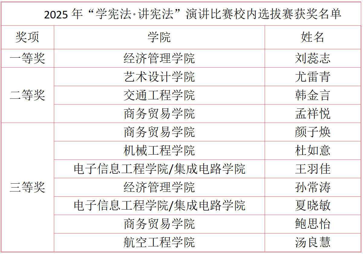 此次“学宪法 讲宪法”比赛校内选拔赛的成功举办,不仅为学生提供了一个学习宪法、交流感悟的平台,进一步加深了同学们对宪法知识的理解和掌握,更在校园内营造了尊崇宪法、学习宪法、遵守宪法、维护宪法、运用宪法的浓厚氛围。未来,我校将持续推进宪法学习宣传教育工作,引导更多学生成为宪法的忠实崇尚者、自觉遵守者和坚定捍卫者,为法治中国建设贡献青春力量。