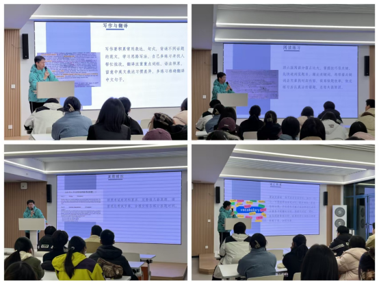 针对分值占比较大的阅读模块,他分享了“关键词定位法”,指导同学们先浏览题目圈划重点,再带着问题找原文对应内容,同时重视错题分析。写作与翻译部分,他建议积累常用表达和话题范文,翻译时注意中英文表达差异,多练习文化类词汇的准确转换。此外,按考试时间全真完整模拟真题很重要,有助于大家提前适应答题节奏。