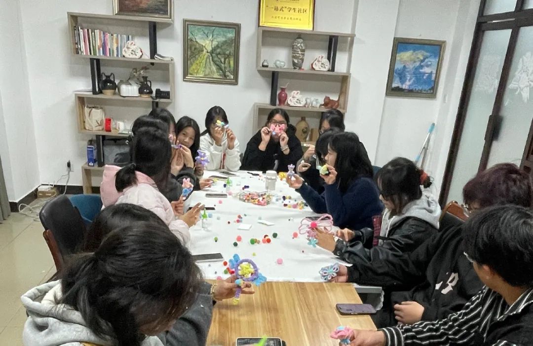本次活动在温暖和谐的氛围中进行,每根扭扭棒在同学们手中弯曲、扭转,变幻成精美的作品,这不仅是手工的创作,更是心灵的表达与个性的彰显。本次活动也是人文艺术系党总支以“文化同行,‘寓’见美好——传统文化和‘一站式’学生社区的融合发展”为主题的“书记项目”活动之一。