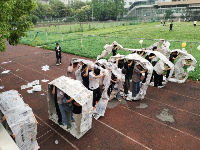 随后登场的是“无敌风火轮”环节。将团队协作推向新高度每组需用50张废纸与一卷胶带,合力搭建一个能容纳6人同步前进的“风火轮”。这个看似简易的纸环装置,在行进中稍有不慎便会散架,需要成员边前进边修补纸环摩擦地面的沙沙声、修补时的急切讨论声、冲线时的欢呼声交织成曲,最终“607”队以46秒的流畅配合率先冲线,摘得此轮桂冠。