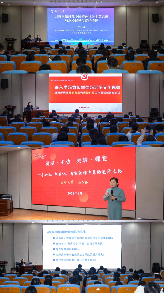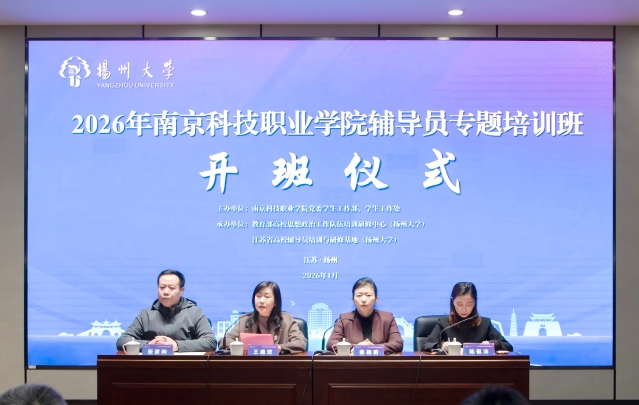 为深入学习贯彻习近平新时代中国特色社会主义思想和习近平文化思想,落实立德树人根本任务,推动辅导员队伍专业化职业化发展,切实提升辅导员思想政治教育、学生管理服务水平。2026年1月19日至20日,学校组织学生工作队伍赴教育部高校思想政治工作队伍培训研修中心(扬州大学)开展专题培训。南京科技职业学院学工处、团委、各二级学院书记、副书记及全体辅导员共同参与此次培训。