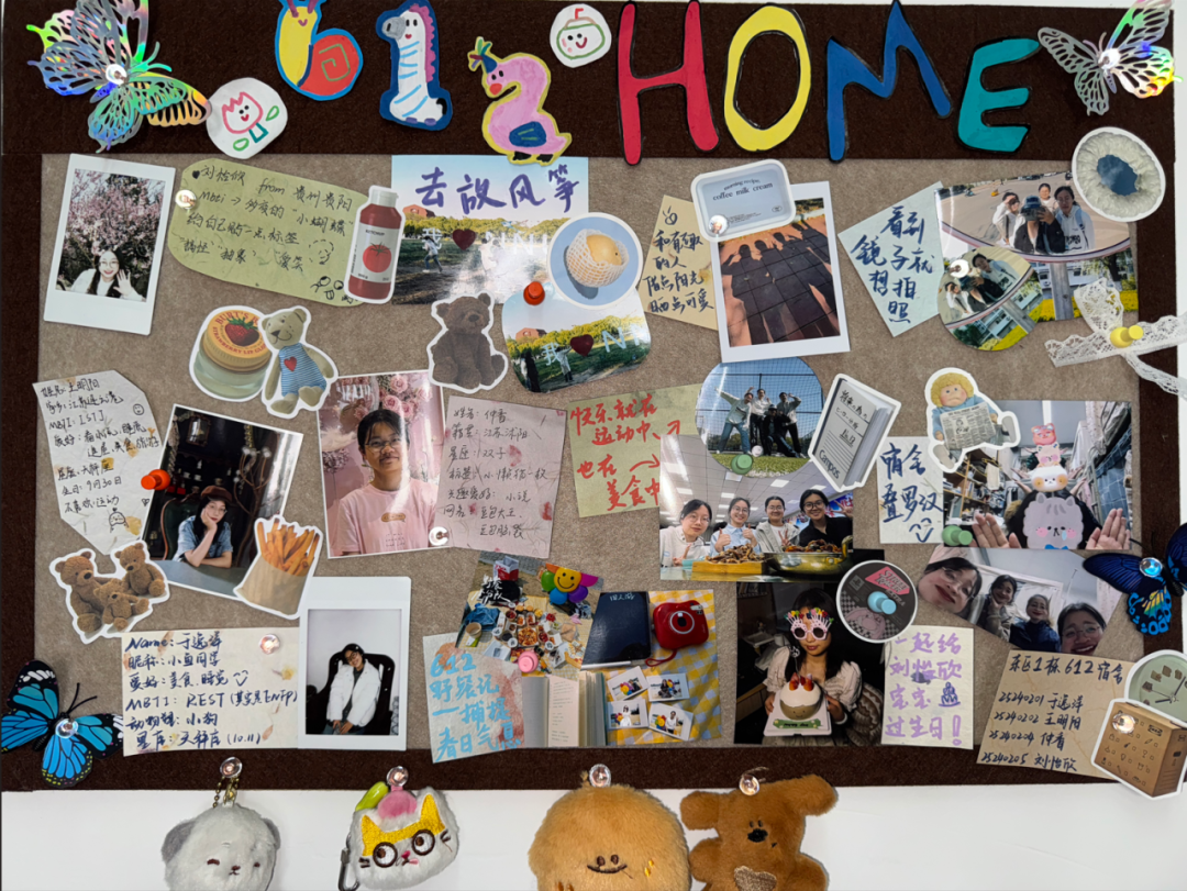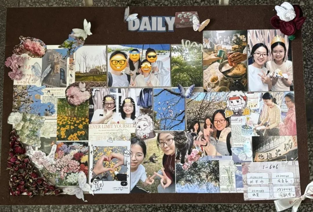 1-612号宿舍的照片墙宛如时光收藏夹,记录着四位女孩的热爱与欢笑。照片里,聚餐时氤氲的烟火气、风筝下雀跃的欢呼、野餐垫上洒落的阳光、生日蛋糕前闪烁的烛光,还有搞怪自拍时夸张的表情,每一帧都鲜活生动。个人风采与集体合影相互辉映,见证着她们携手同行的足迹。愿这面充满温度的照片墙,继续珍藏独属于她们的精彩瞬间。