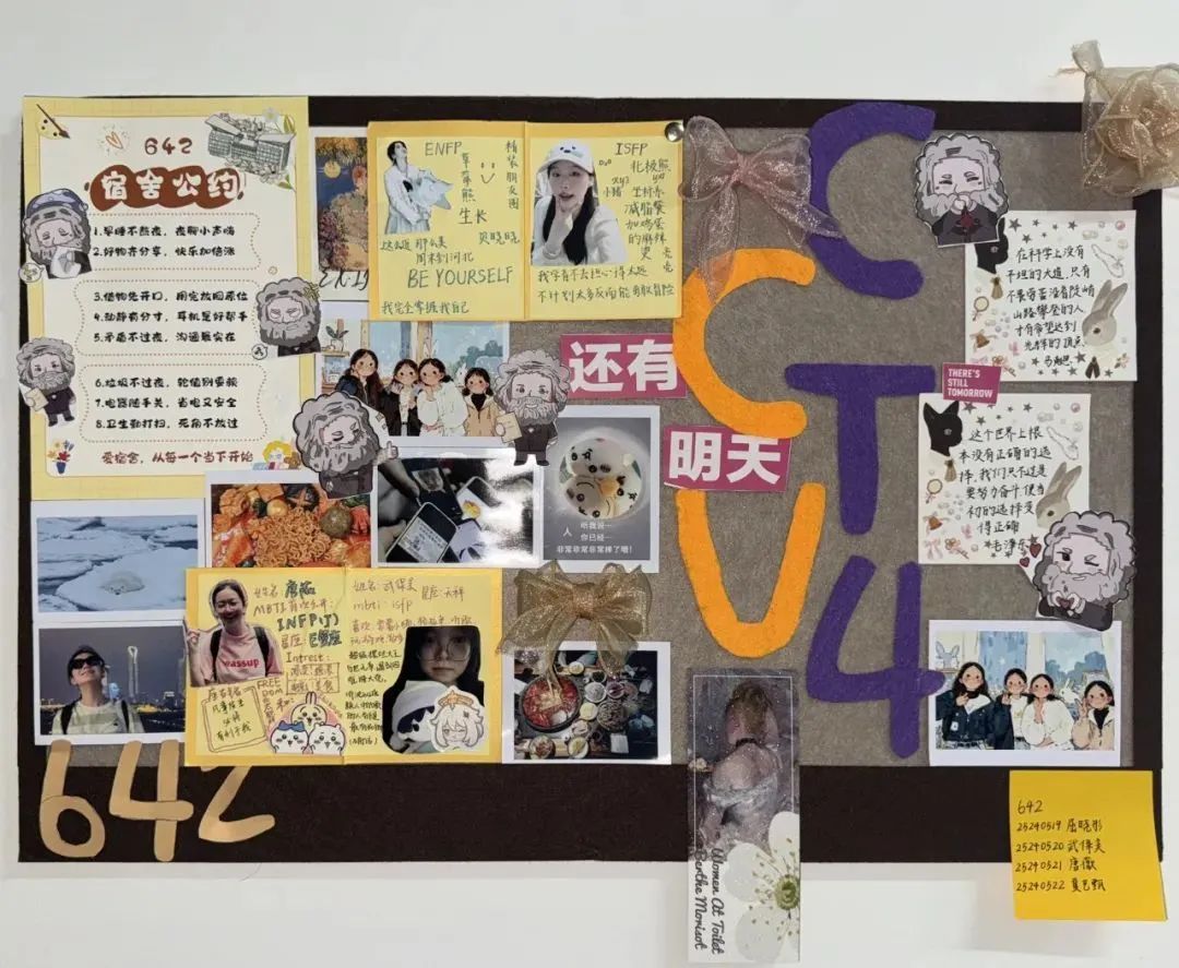 4-532宿舍的文化墙,是一方盛满温情与活力的小天地,更是宿舍生活的生动写照。整齐排列的合照,将室友间的深厚情谊定格成永恒;满载心意的祝愿卡片,传递着对彼此的美好期许。马老师贴纸俏皮可爱,校园文创独具韵味,这些学院元素的巧妙融入串联起无数日常趣事。个性物品错落点缀其间,既凝聚着青春朝气,又传承着学院底蕴,静静见证着女孩们的成长足迹。