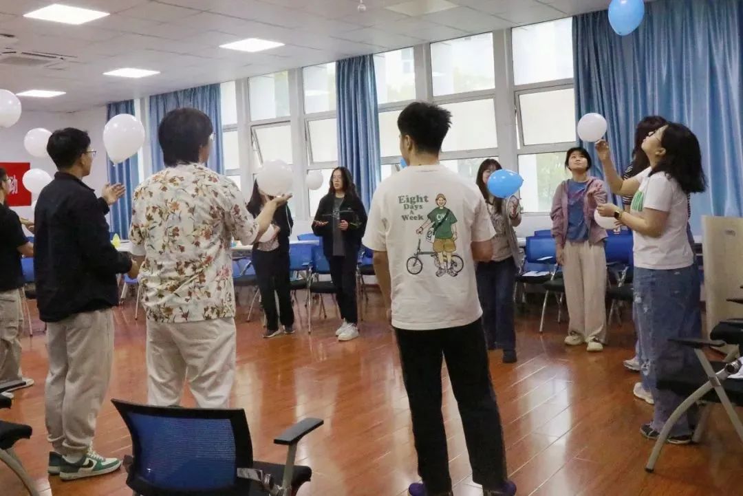 接下来,同学们将写满烦恼的纸条装入气球并将其抛向空中。随着气球的起伏,大家仿佛看到自己的焦虑也轻轻飘散。当气球落地的那一刻,承载的不只是文字,更是过去烦恼的释怀与重新出发的勇气。活动尾声,大家围成一个圈,为身边的伙伴轻拍后背、捏捏肩膀,每一次触碰都在默默诉说:“你并不孤单,我们与你同行”。