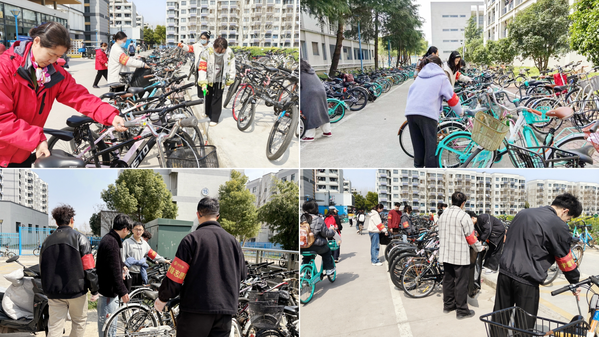 志愿者们将停放杂乱的自行车摆放整齐,红色袖章成为校园里一道温暖的风景线。经过大家的共同努力,单车停放有序、道路通畅美观,宿舍苑区周围环境焕然一新。