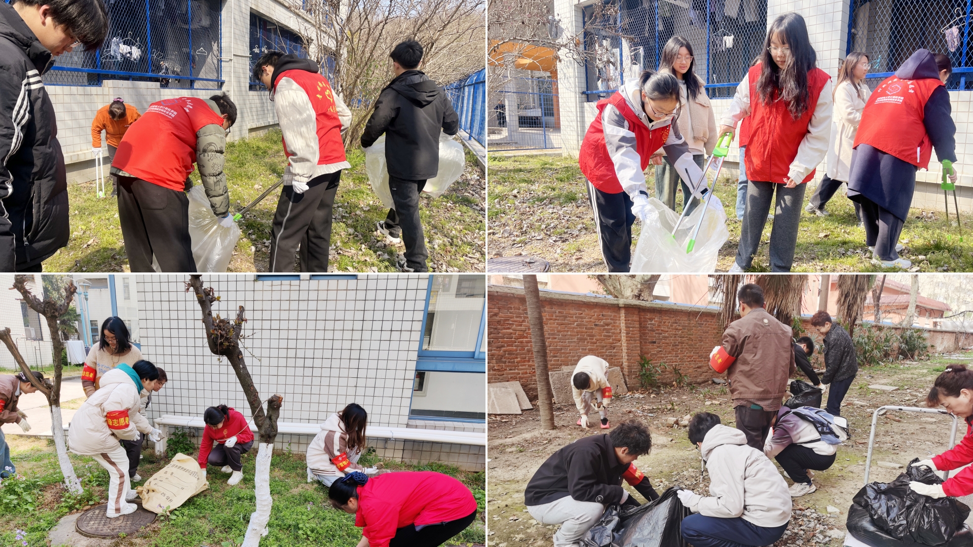 在仙林和三牌楼校区,聚焦宿舍区周围环境,开展了清理垃圾、整理道路车辆等系列美化校园活动。在宿管阿姨的指导下,志愿者们手拿垃圾袋、手持垃圾钳,对宿舍区内外的马路、草坪、停车位等卫生死角展开了全方位清理。