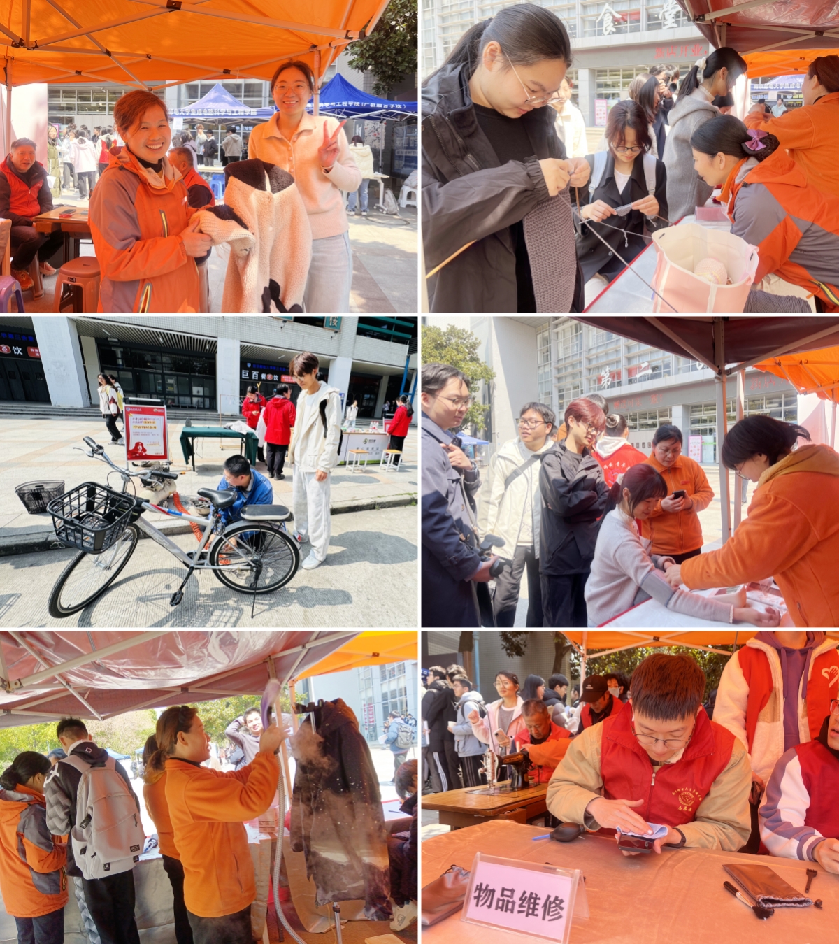 在南二、南三食堂广场,宿舍物业人员和学生志愿者们聚焦师生需求,搭建爱心服务台,免费提供缝补背包、熨烫衣服、测量血压、维修自行车、清洁手机等志愿服务。学生志愿者用所学专业知识,提供电脑系统升级、手机维修清洁、预防电信网络诈骗知识讲解等服务。活动现场人头攒动,服务暖心,赢得了师生的广泛好评。