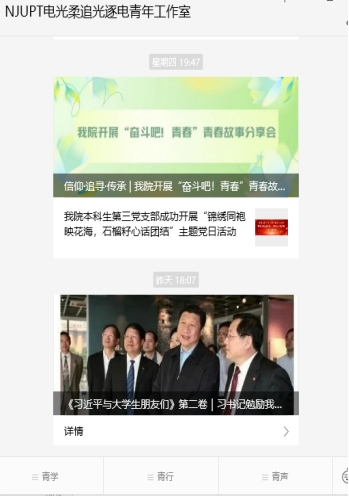南邮电光柔学院立足“数字+”育人理念,将虚拟现实、大数据分析等技术与第二课堂深度融合,构建起覆盖学业发展、科研创新、生涯规划、心理健康等维度的“虚实融合”育人场景。其中,学院官方青年微信公众号“NJUPT电光柔追光逐电青年工作室”成为学生社区治理的“智慧中枢”,通过“四维度”服务体系打造全周期成长支持闭环。2024年9月全新上线的“青声”数字化服务平台,为学生的校园生活提供新的发声路径。更新后的“NJUPT电光柔追光逐电青年工作室”包含以下内容: