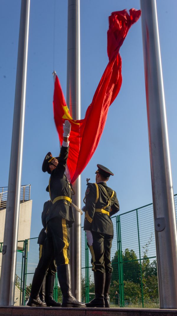伴随着雄壮的国歌声,五星红旗冉冉升起,拉开了开学典礼的序幕。