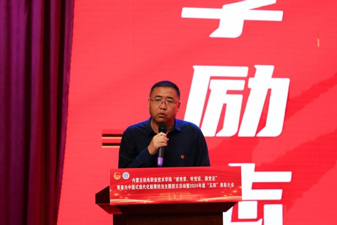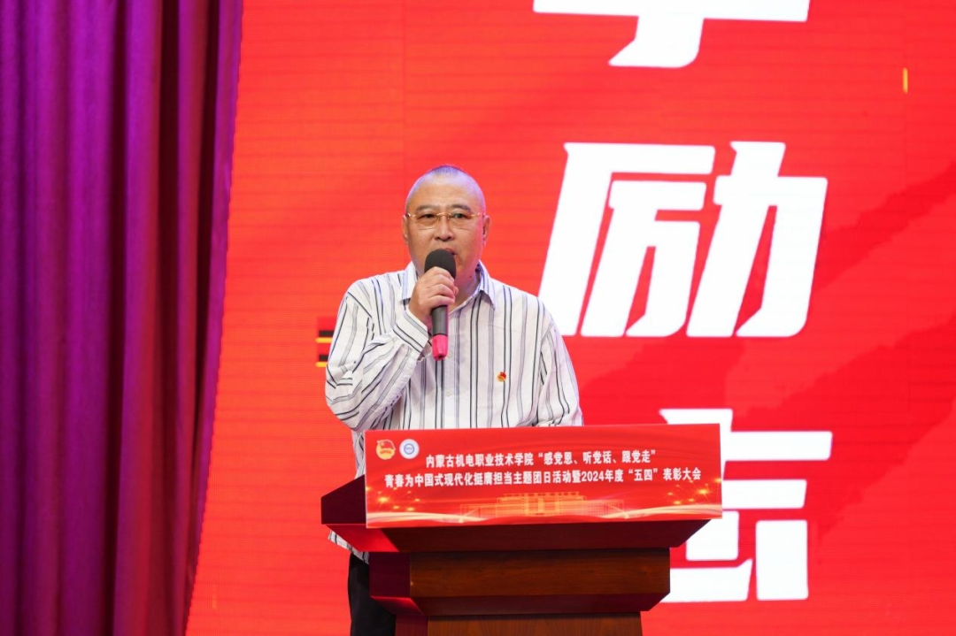 为纪念中国人民抗日战争暨世界反法西斯战争胜利80周年纪念活动,展现青年学子昂扬向上的精神风貌,进一步引领我院广大青年学子坚定信念跟党走,弘扬共青团优良传统,传承五四精神,彰显新时代青年的责任与担当,学院团委于5月19日下午举办“感党恩、听党话、跟党走”—青春为中国式现代化挺膺担当主题团日活动暨2024年度“五四”表彰大会。学院党委副书记高军出席并讲话,学生工作处处长刘志文、信息工程系党总支书记李刚、团委书记张婷凯、机电工程系副主任武艳慧及各系部党总支副书记、各系团总支书记、团学干部、获奖师生、青年学生代表出席此次活动。
