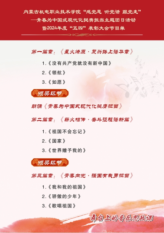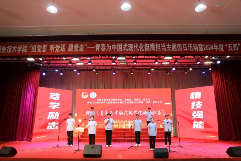 此次大会为团员青年指明了前进方向,进一步继承和弘扬了“五四”精神,引导我院青年学子以身边的先进个人和青年集体为榜样,用担当作为书写青春篇章,奉献青春力量。用“艺术+思政”的形式,将红色资源融入教育实践,通过多样化的艺术形式,激励我院学生筑牢理想信念,上好一堂在舞台上的音乐“思政课”,为实现中华民族伟大复兴的中国梦贡献内机电的青春力量!