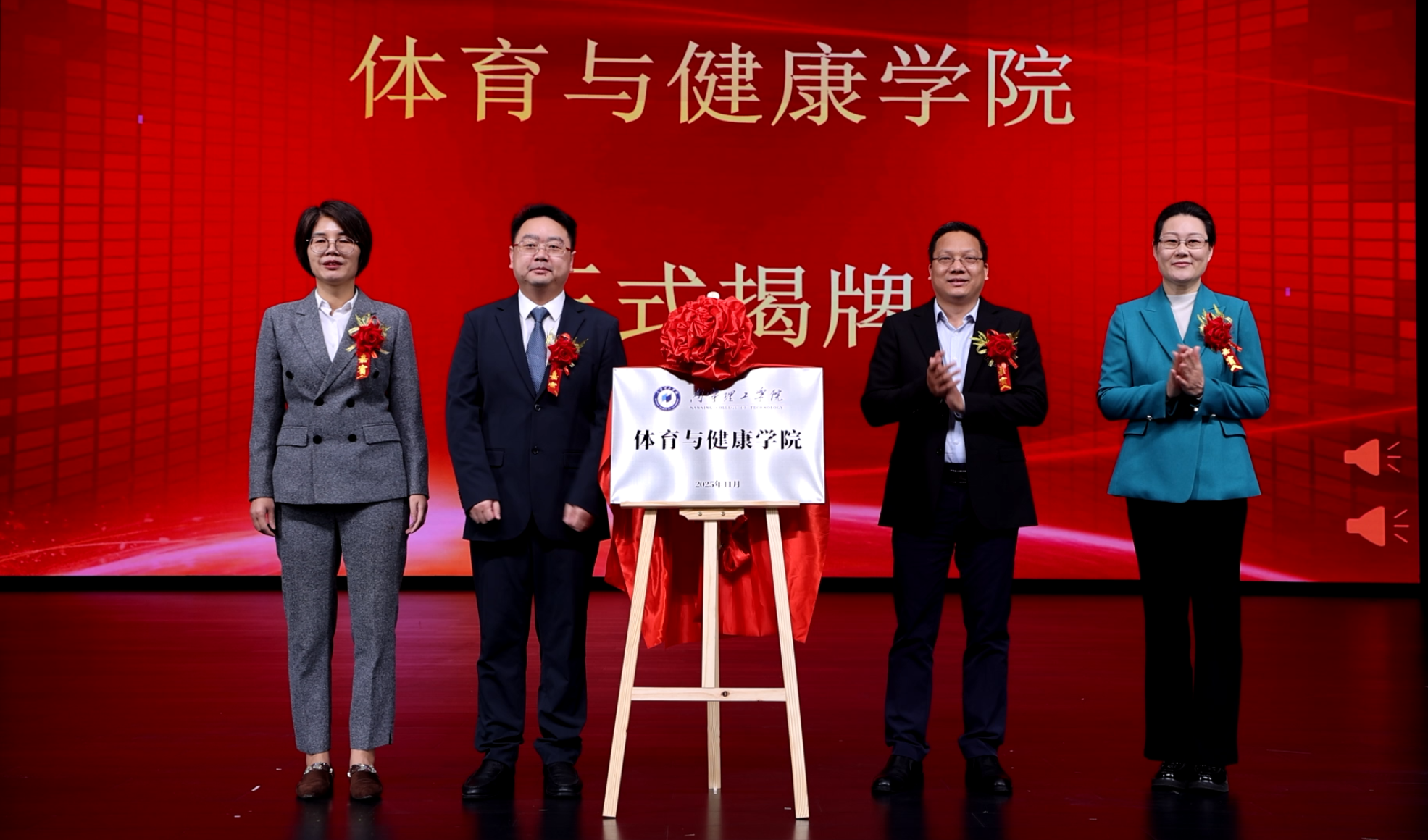 在全体与会人员的热烈期待中,与会领导与嘉宾共同为“南宁理工学院体育与健康学院”揭牌。红绸揭开的瞬间,全场掌声雷动,标志着学校体育学科建设正式开启高质量发展的新篇章。