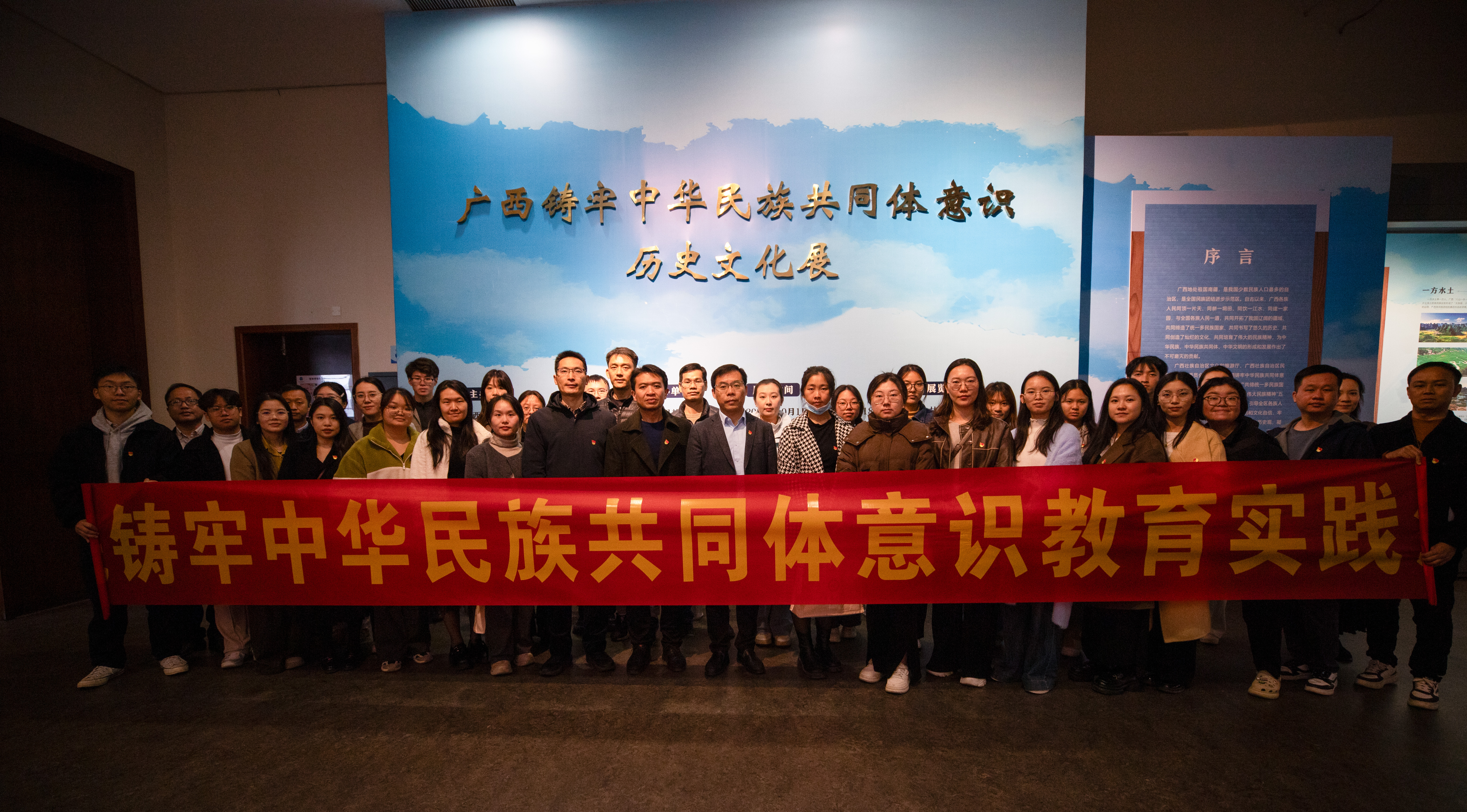 为引导师生牢固树立正确的中华民族历史观,自觉增强“四个与共”的中华民族共同体理念,12月10日下午,学校组织师生党员、各党支部统战委员、党外人士代表前往桂林博物馆参观由自治区党委宣传部、自治区党委统战部主办的广西铸牢中华民族共同体意识历史文化展。