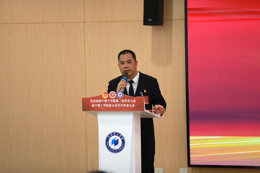 梁杰同志代表共青团南宁理工学院第一届委员会向大会作《跟党奋进强根基 勇担使命开新局让青春力量在学校高水平应用型大学建设中绽放光芒》的工作报告。报告全面回顾了过去五年我校共青团在组织建设、实践育人、文化浸润、双创驱动、师生服务等方面取得的突出成就与宝贵经验,深刻分析了新征程上面临的形势与使命。深刻分析了“思想领航+文化润心”、“组织赋能+服务暖心”、“实践筑梦+双创驱动”、“从严治团+青春铸魂”等四大工程的任务与具体路径,以思想政治引领为核心,以服务青年为生命线,以改革创新为动力,团结带领全校青年在学校高质量发展,民族复兴征程中挺膺担当。