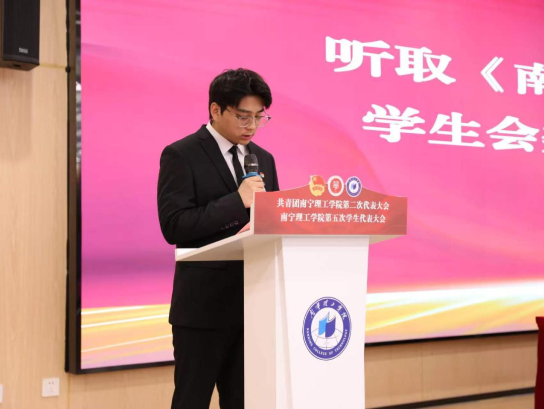 张佳顺同学代表南宁理工学院第四届学生会向大会作《锚定时代坐标 勇担青春使命 引领南理青年在强国建设新征程中书写青春华章》的工作报告。过去一年,学生会在学校党委领导,团委指导下,紧扣“立德树人”根本任务,在思政引领、实践服务、文化建设、服务师生等领域深耕细作,用实干彰显青春担当,用实绩回应同学期盼,同时,也认真分析了工作中存在的不足,并在未来着力改进。站在“十五五”规划开局之年,学生会将锚定“为党育人、为国育才”根本方向,践行“新起点、新路线、新使命”发展理念,团结带领全体南理学子,在服务同学成长、助力学校发展中续写青春华章。