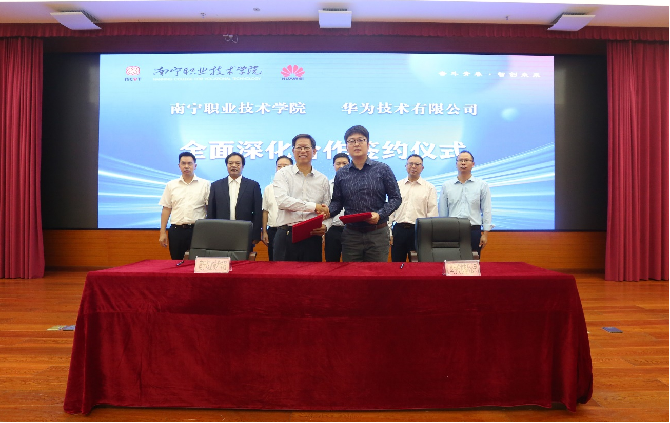 11月10日,南宁职业技术学院与华为签订全面深化合作协议,签约仪式在南宁职业技术学院举行。南宁职业技术学院校长周旺、华为科技有限公司广西政企副总经理杨昊分别代表签约,南宁市大数据发展局副局长颜以锋出席并见证签约。