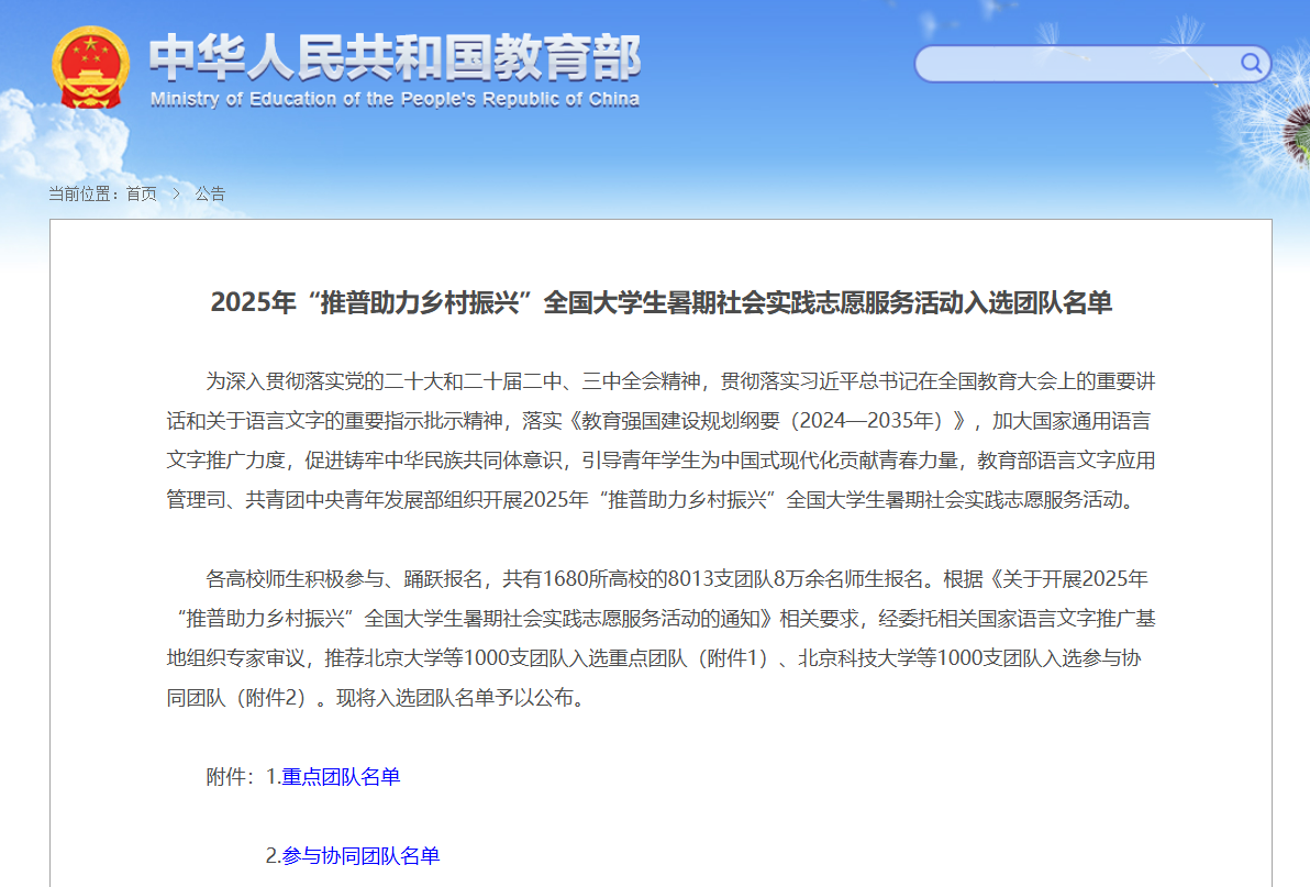此次活动由教育部语言文字应用管理司、共青团中央青年发展部联合组织,旨在深入贯彻落实党的二十大和二十届二中、三中全会精神,践行习近平总书记关于语言文字工作的重要指示批示精神,加大国家通用语言文字推广力度,引导青年学生以实践行动赋能乡村振兴。活动吸引了全国1680所高校的8013支团队、8万余名师生参与,最终评选出1000支重点团队和1000支参与协同团队。