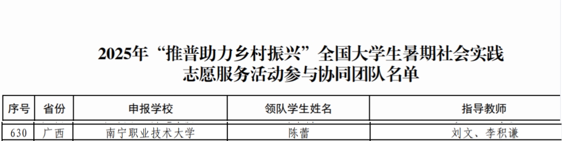 近日,教育部公布2025年“推普助力乡村振兴”全国大学生暑期社会实践志愿服务活动入选团队名单,南宁职业技术大学传媒学院现代文秘专业“畅言”实践团队凭借扎实的项目规划与专业优势,成功入选参与协同团队。