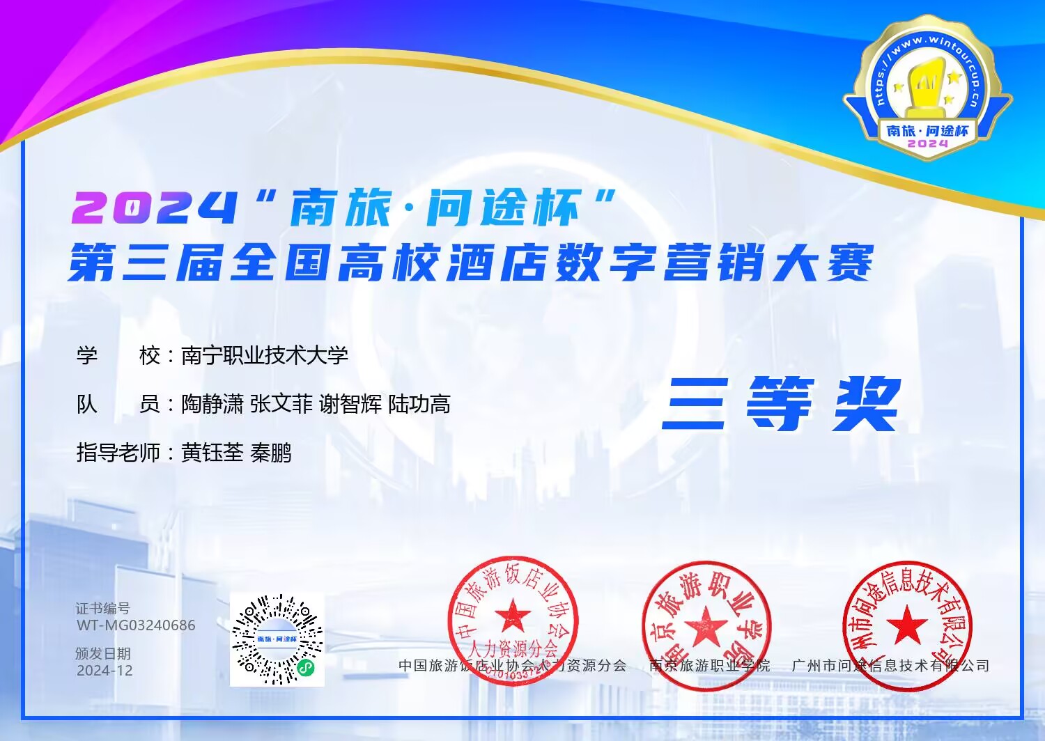在校期间荣获2024“南旅・问途杯”第三届全国高校酒店数字营销大赛三等奖(陆功高/供图)