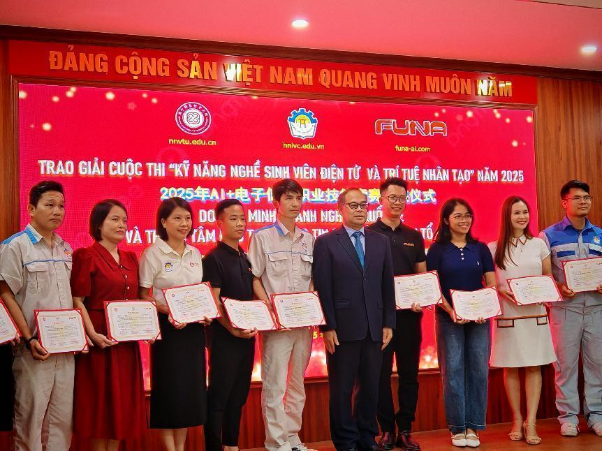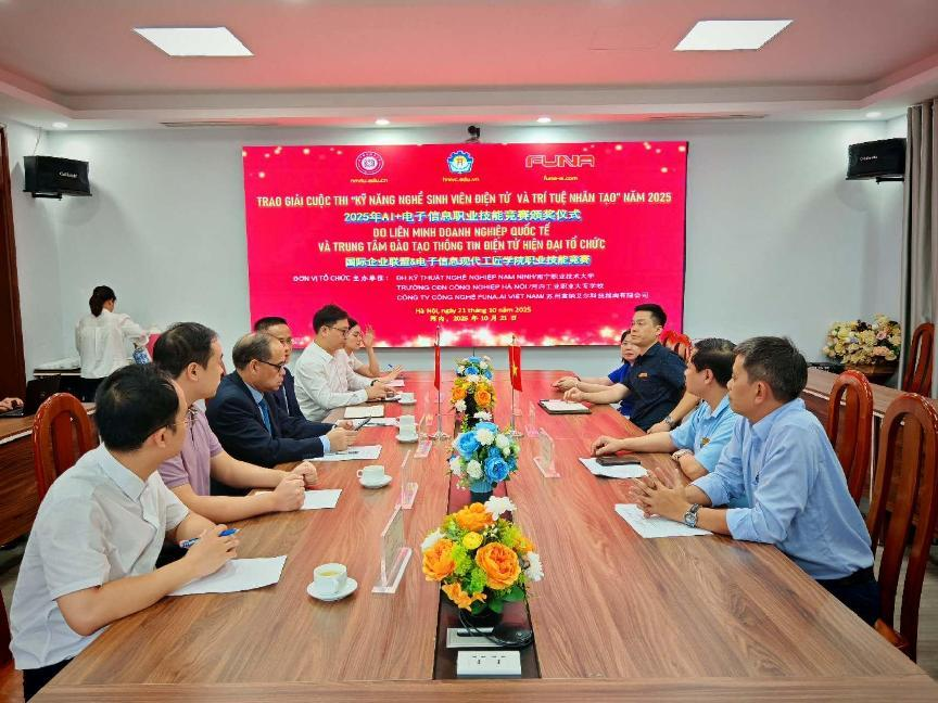10月21日,中国—越南电子信息现代工匠学院“AI+电子信息”职业技能竞赛,在越南河内工业职业大专学校圆满收官。颁奖仪式上,中国驻越南大使馆参赞罗耀光,南宁职业技术大学智能工程学院骨干教师陈明、张宁,河内工业职业大专学校校长范氏恒,苏州富纳艾尔科技有限公司总经理卢骏等嘉宾共同出席。