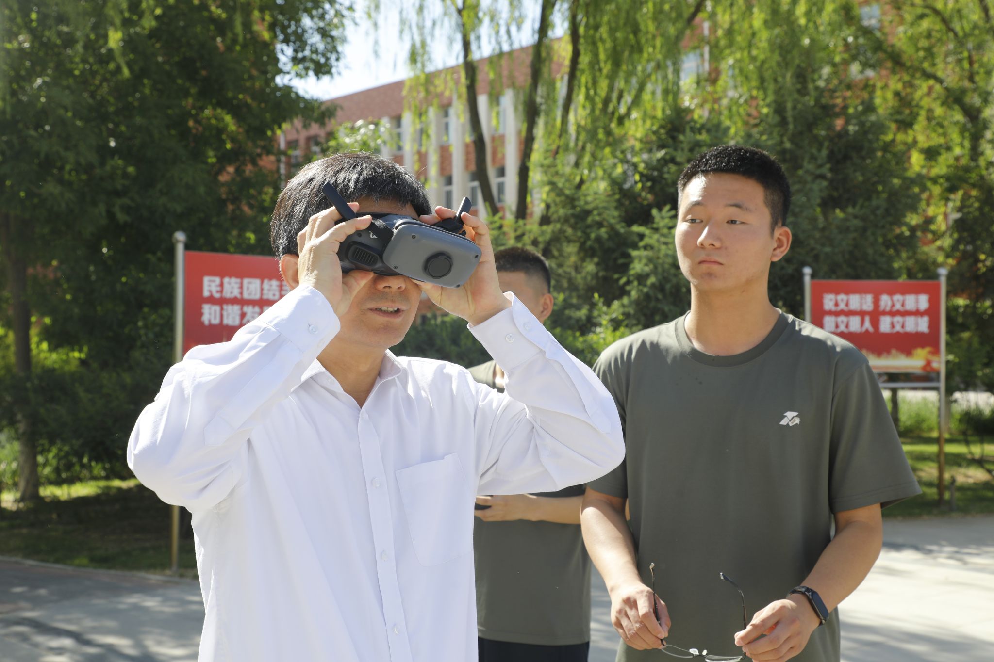 展演期间,周震校长戴上VR眼镜,瞬间“置身”于无人机的第一视角,透过实时传输的画面,穿越机如离弦之箭穿梭于障碍赛道,在低空掠过草坪、急速绕过立柱的过程中,视角的剧烈变换与精准操控展现出极强的科技张力,亲身经历了一场“空中竞速”。