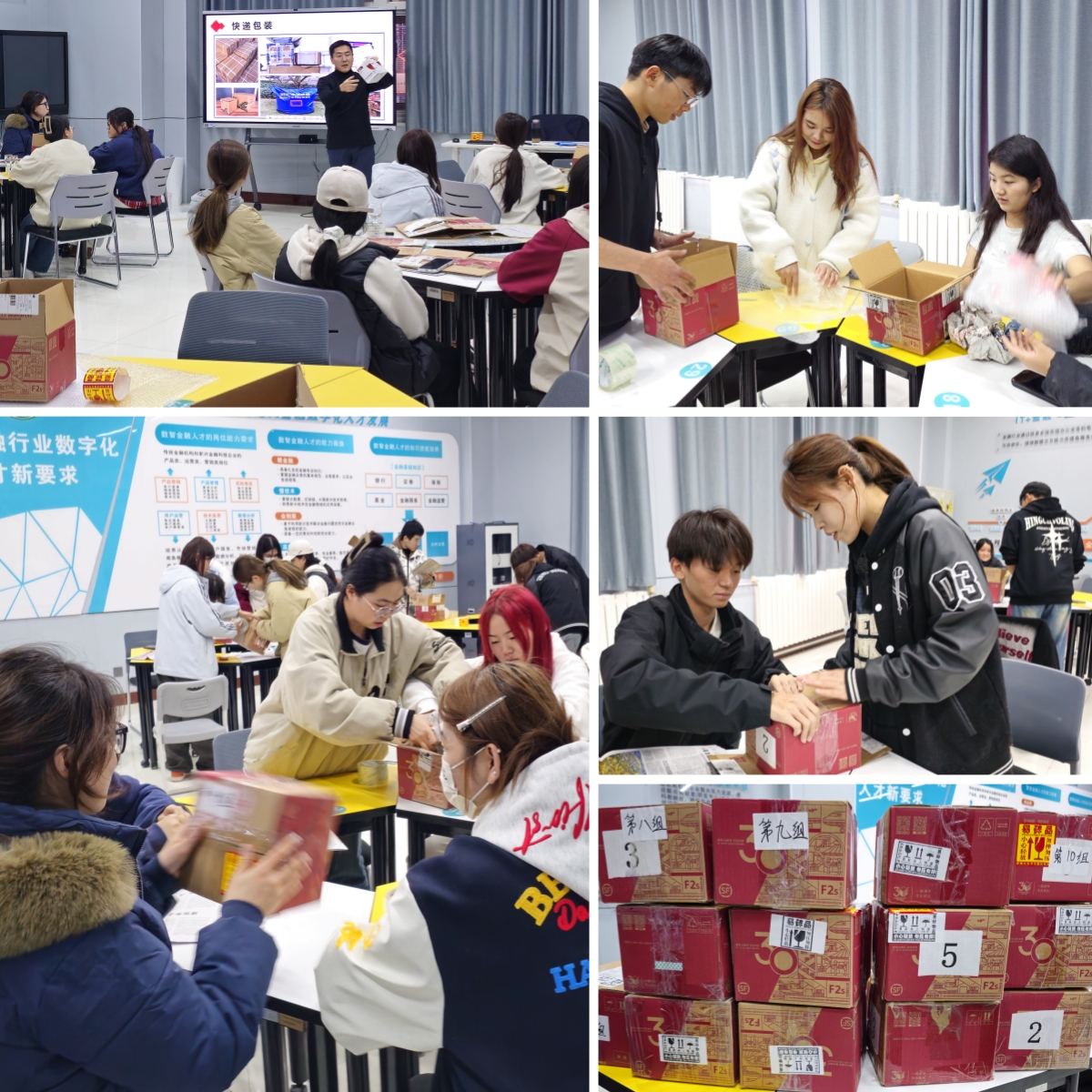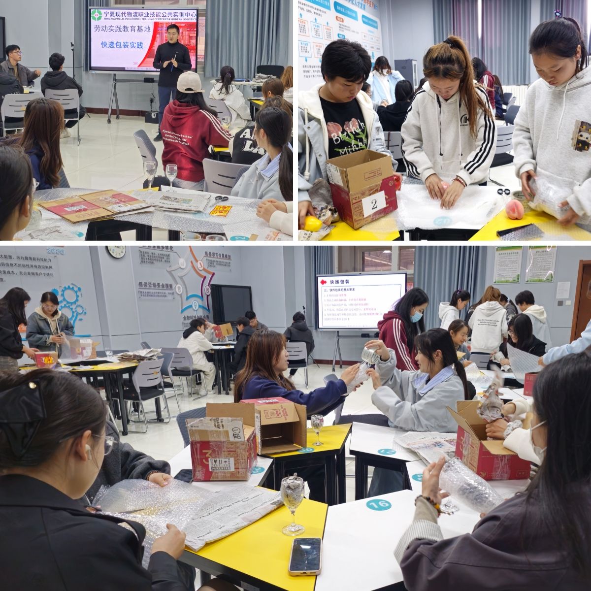 “仓储管理实践”项目中,同学们学会了手动托盘搬运车(地牛)的使用方法,并使用搬运设备完成了货物出入库作业流程;“快递包装实践”项目中,同学们利用纸箱、气泡膜、胶带、废旧报纸、快递面单等耗材以小组的形式完成了易碎物品包装作业。通过实践活动,进一步深化了同学们对“实干筑美好”的认知,更让“劳动育德、实践砺行”的理念深入人心。