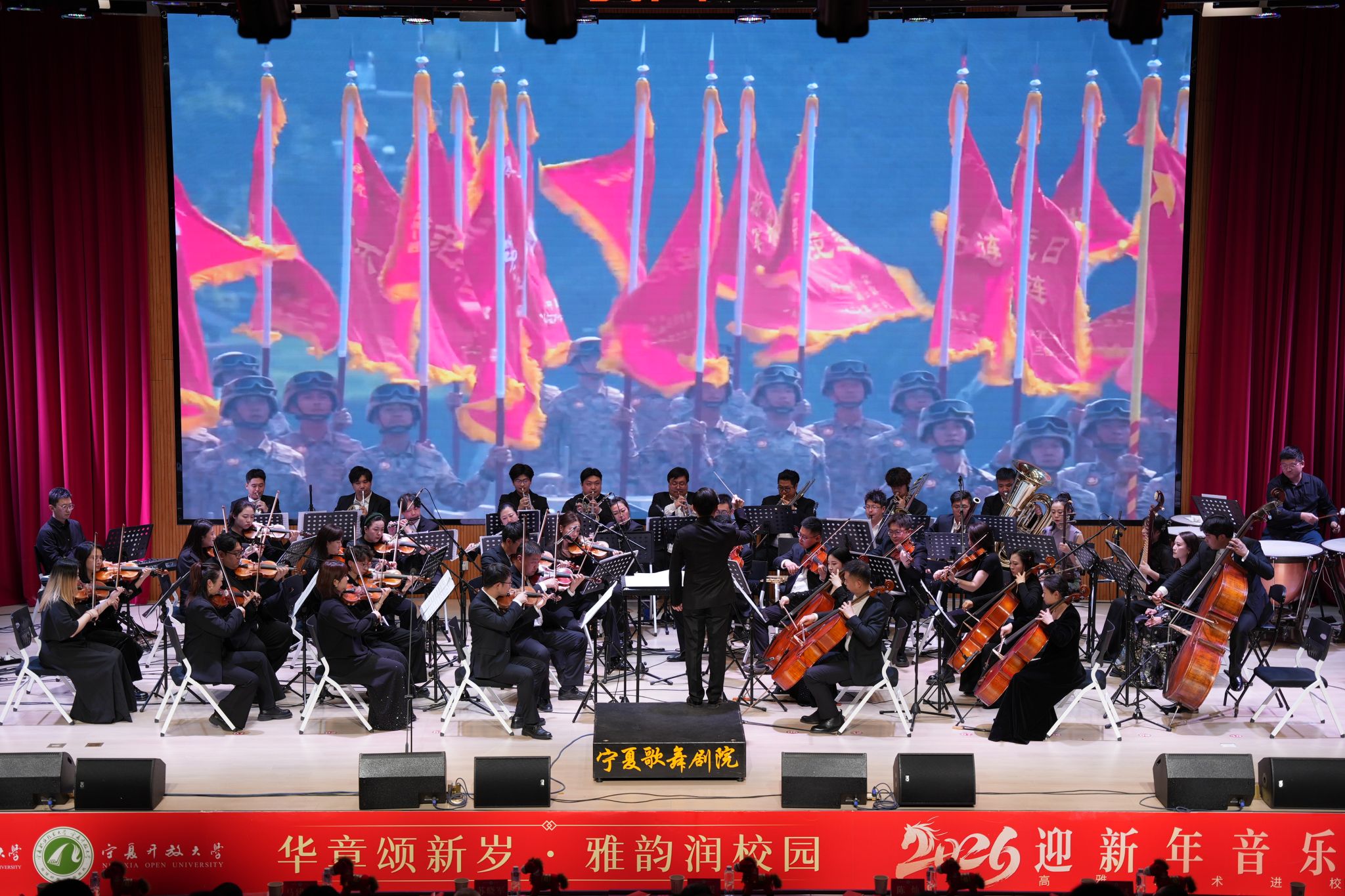 本次音乐会特邀宁夏演艺集团歌舞剧院艺术家走进校园,为师生带来一场视听盛宴。音乐会分为“经典交融,华彩绽放”“时代心声,家国情怀”“乐韵飞扬,共迎新春”三个篇章。艺术家们精彩演绎了《春节序曲》《茉莉花》《狩猎波尔卡》《匈牙利舞曲第五号》《赛马》《如愿》等中外经典曲目,既有民族音乐的深情婉转,也有西方古典的庄重典雅,更有时代金曲的昂扬奋进,赢得了现场观众的阵阵掌声。