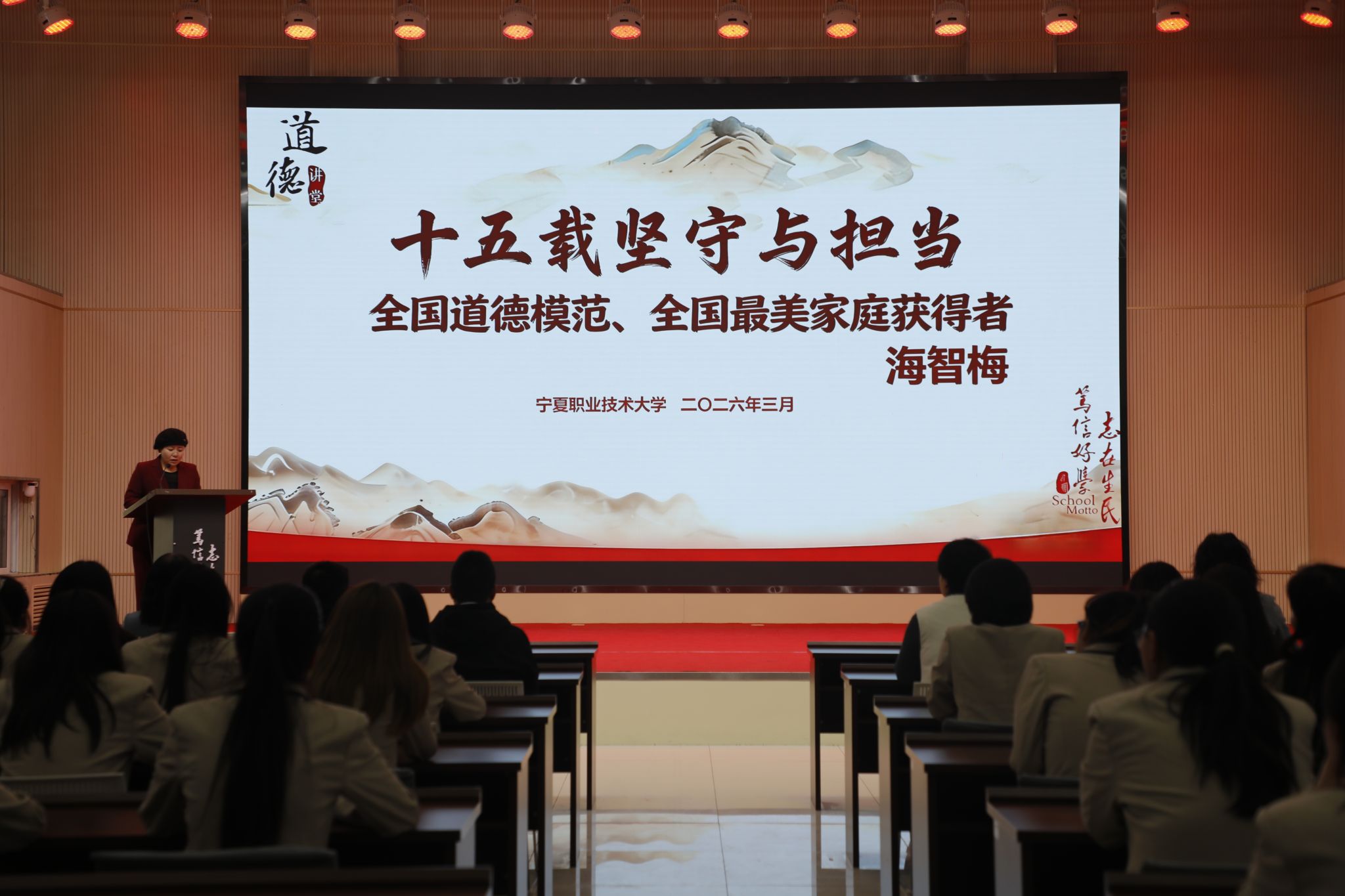 此次道德讲堂是一次深刻的“精神赋能”与“职业导航”。健康管理与社会服务学院秉持“承传国粹 健康报国 孝亲尊师精术济人”的院训,紧密对接“健康中国2030”战略,智慧健康养老服务与管理专业获批国家工信部“产教融合专业合作建设试点单位”。海智梅老师十五年如一日的孝老爱亲事迹,与学院育人理念高度契合,为学子们上了一堂生动的“职业思政课”。此次活动的成功举办,正是学校“匠心筑梦 立德铸魂”道德讲堂育人理念的生动实践,必将引导广大师生以榜样为引领,将感动化为坚守,在服务健康中国建设和宁夏健康养老产业高质量发展的征程中书写青春华章。