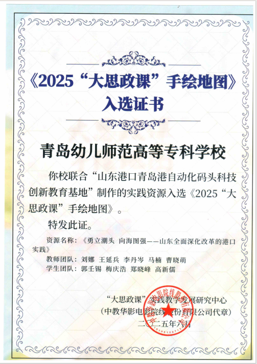 近日,教育部《2025“大思政课”手绘地图》正式发布,青岛幼儿师范高等专科学校联合“山东港口青岛港自动化码头科技创新教育基地”创作的实践视频资源《勇立潮头 向海图强——山东全面深化改革的港口实践》成功入选,成为全国思政实践教学的示范性成果。