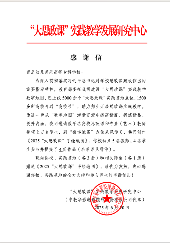为深入贯彻落实习近平总书记关于思政课建设的重要指示精神,教育部委托“大思政课”实践教学发展研究中心打造数字化实践教学平台,汇聚全国5000余个实践基地资源。我校积极响应,组建师生团队,多次赴青岛港自动化码头深度参与,开展实地调研,以港口改革实践为蓝本,凝练出富有时代特色的思政实践教学视频资源;教育部“大思政课”实践教学发展研究中心致函青岛幼儿师范高等专科学校,充分肯定我校师生“将港口发展史诗转化为铸魂育人篇章”的创新实践,高度认可我校在“大思政课”实践教学数字地图建设中的突出贡献。这一殊荣彰显了学校思政课改革前沿探索的阶段性成效,为新时代“大思政课”建设注入了澎湃的海洋力量。