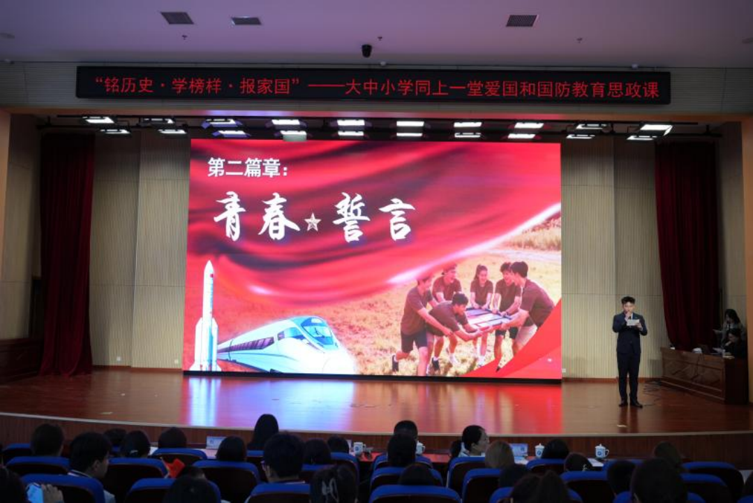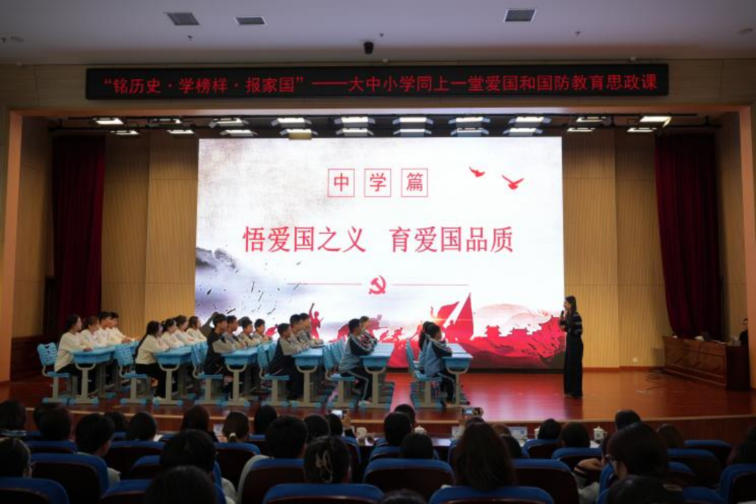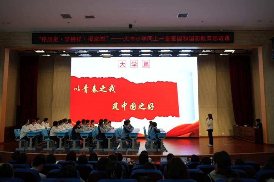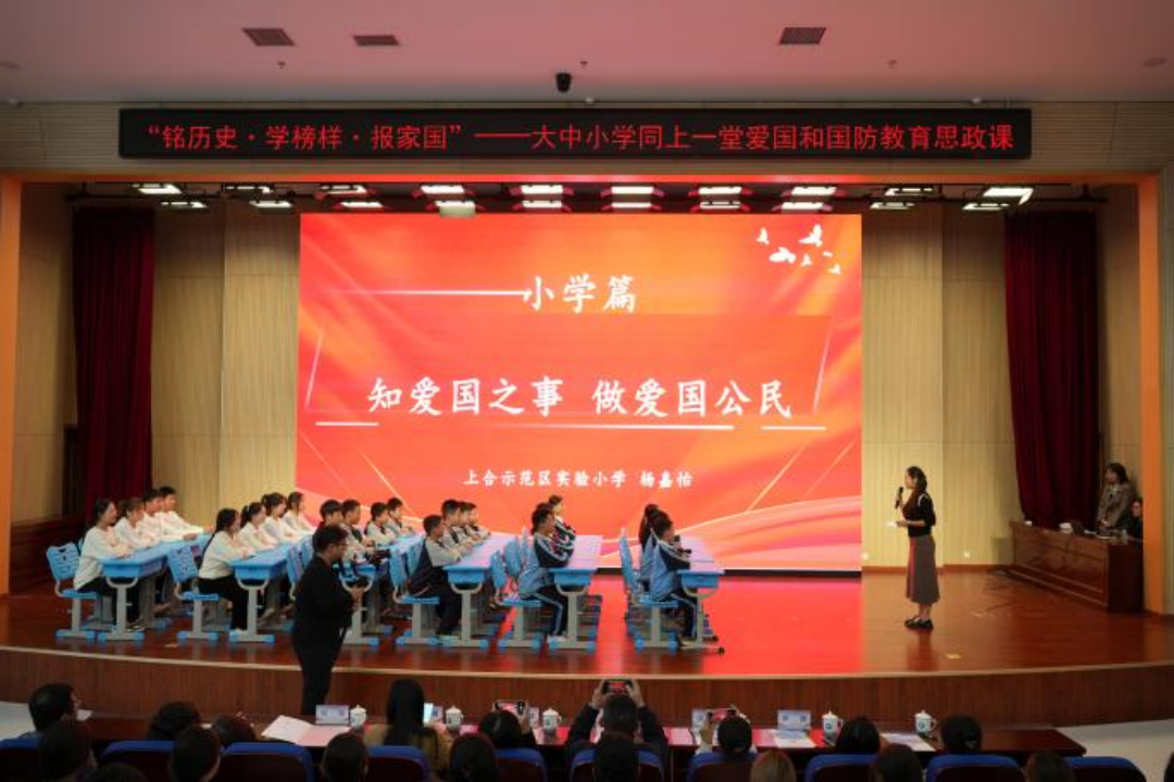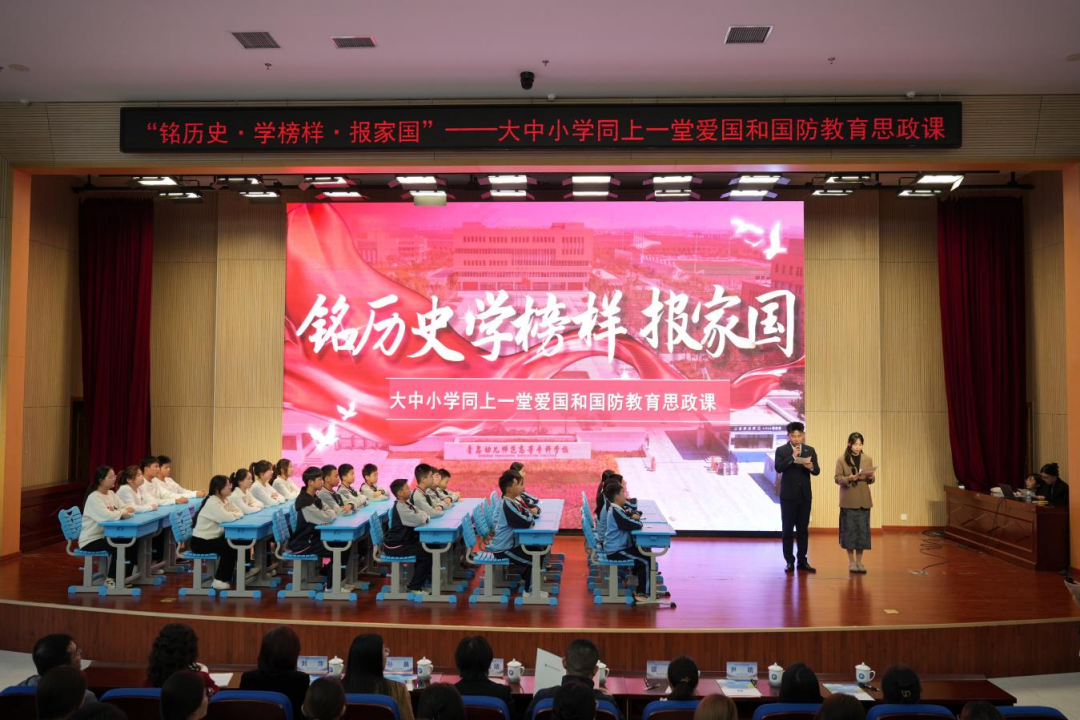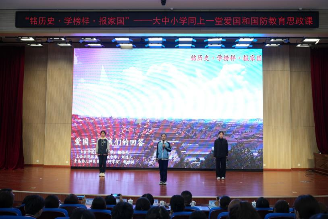 为深入推进大中小学思想政治教育一体化建设走深走实,10月30日,“铭历史·学榜样·报家国——大中小学同上一堂爱国和国防教育思政课”展示活动在青岛幼儿师范高等专科学校举办。胶州市教育和体育局相关负责同志,上合示范区实验初级中学、实验小学师生代表及青岛工学院、青岛第二卫生学校等兄弟院校代表齐聚我校,共同参与这场跨越学段的思政育人实践。