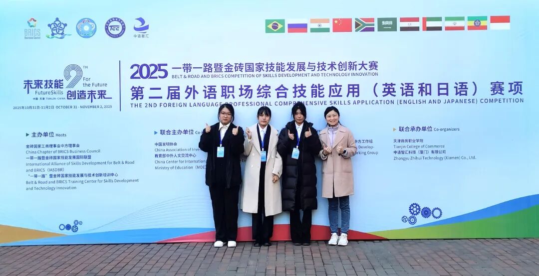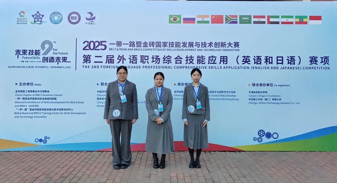 在“2025一带一路暨金砖国家技能发展与技术创新大赛第二届外语职场综合技能应用(英语和日语)赛项”全国决赛中,外国语学院选派的两支代表队同样不负众望,载誉而归。由商务英语专业李梦晨、王晶晶、乔苑组成的英语参赛队,以及商务日语专业孙艺菲、张欣蕊、韩玉娟组成的日语参赛队,团结协作、沉着应对,在与全国77所高职院校代表队的角逐中脱颖而出,双双荣获三等奖。这一成绩充分体现了我校学子在英语与日语专业能力、跨文化沟通、团队协作以及解决职场实际问题等方面的综合素养。