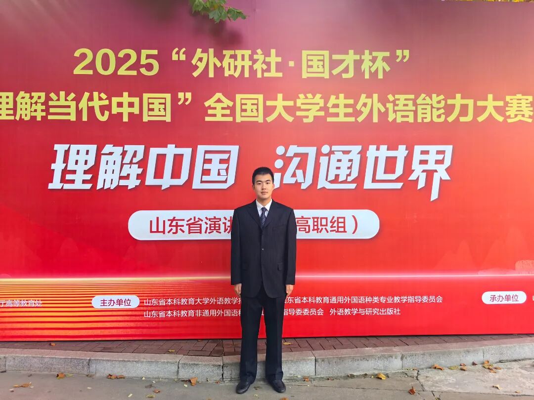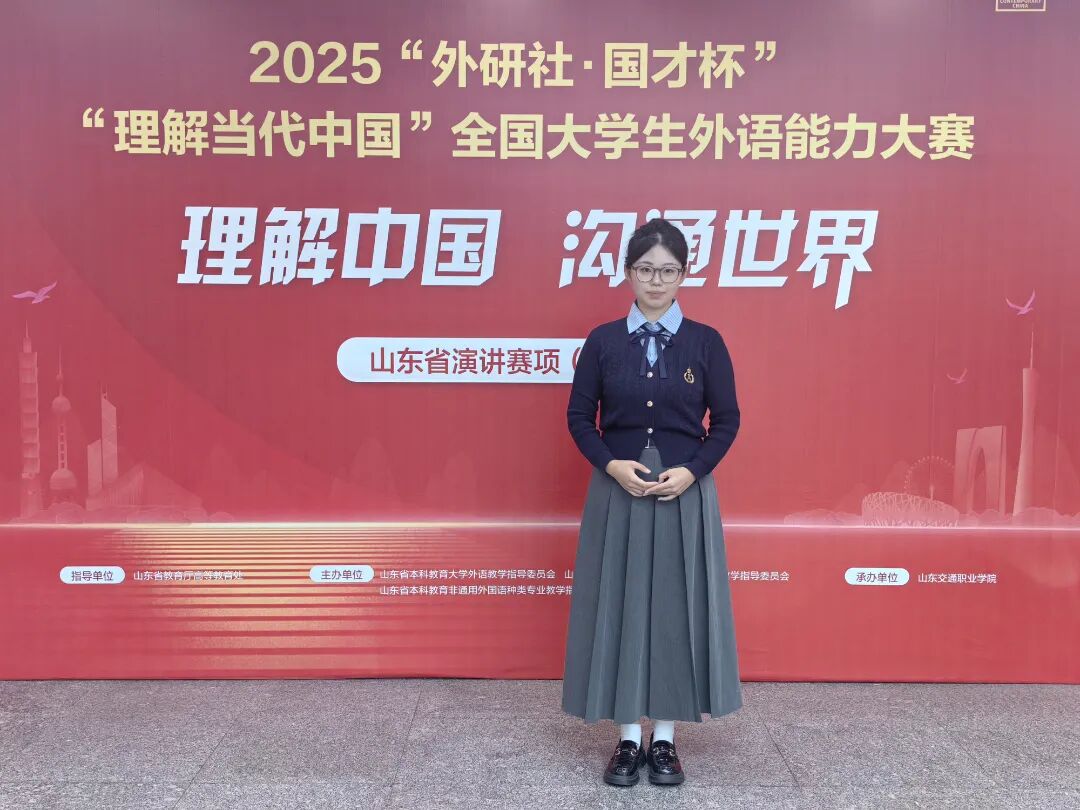 在2025“外研社·国才杯”“理解当代中国”全国大学生外语能力大赛山东省省赛中,文旅与厨艺学院学生金倩倩与珠宝学院学生辛宗宝凭借深刻的主题立意、严谨的逻辑架构与流畅的语言表达,分别斩获写作赛项金奖和银奖;外国语学院学生杨汝泠与商贸学院学生张元恺以出色的语言组织能力、富有感染力的表达和沉稳自信的台风,历经多轮激烈角逐,分获演讲赛项银奖和铜奖。