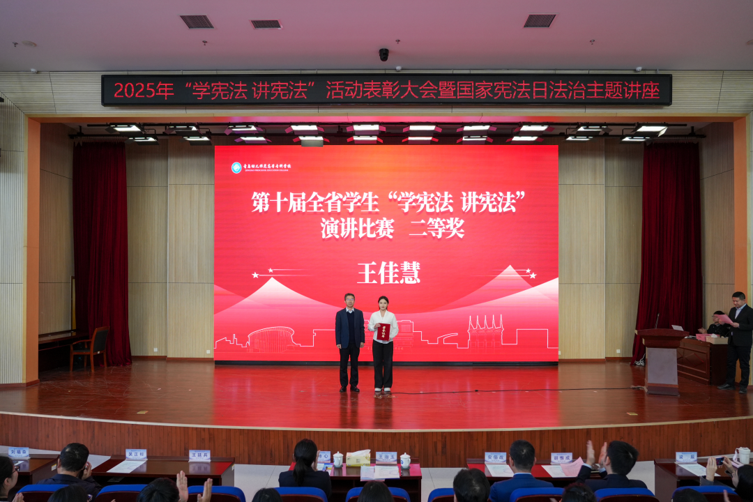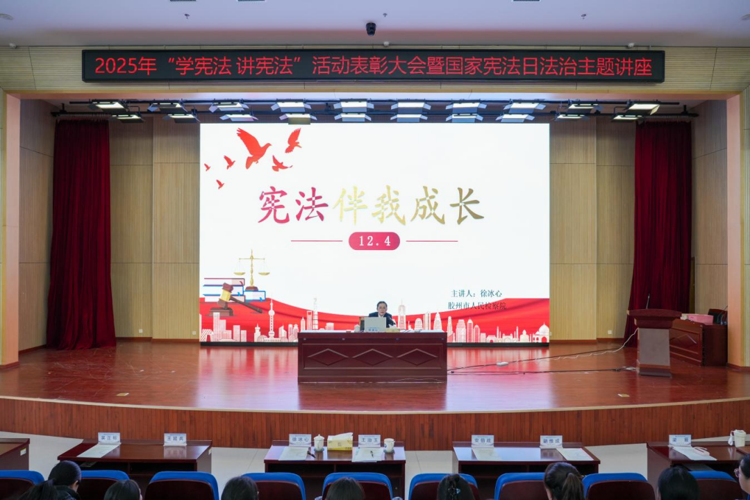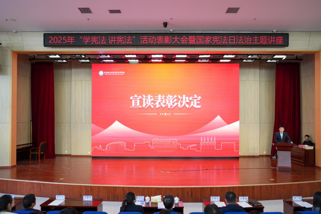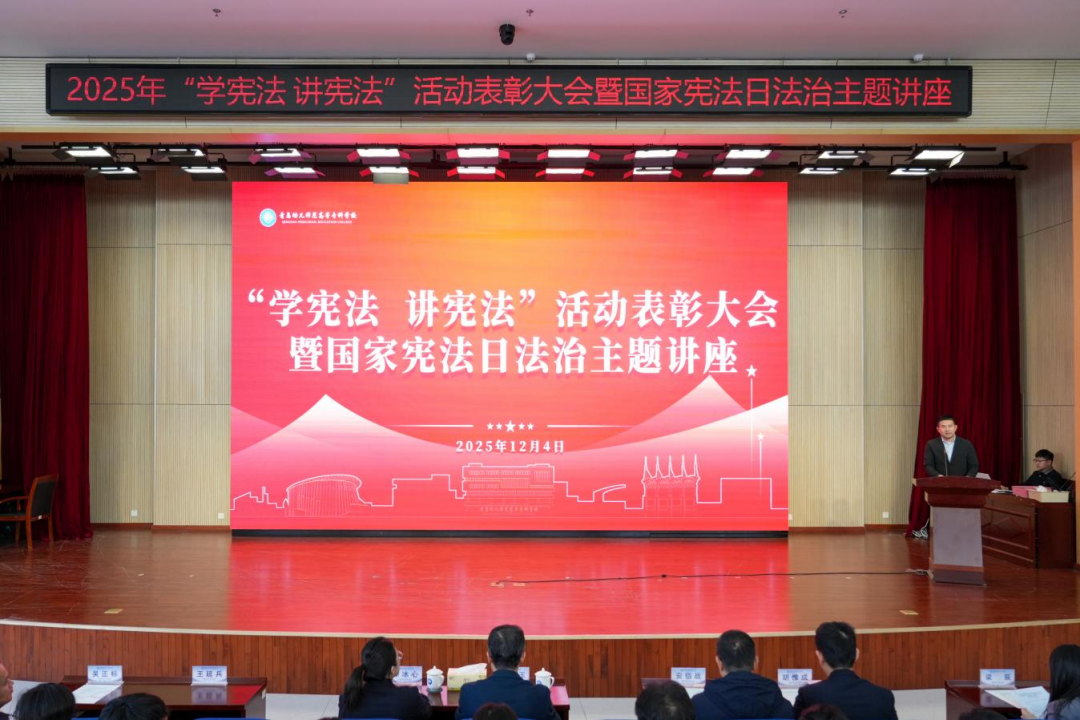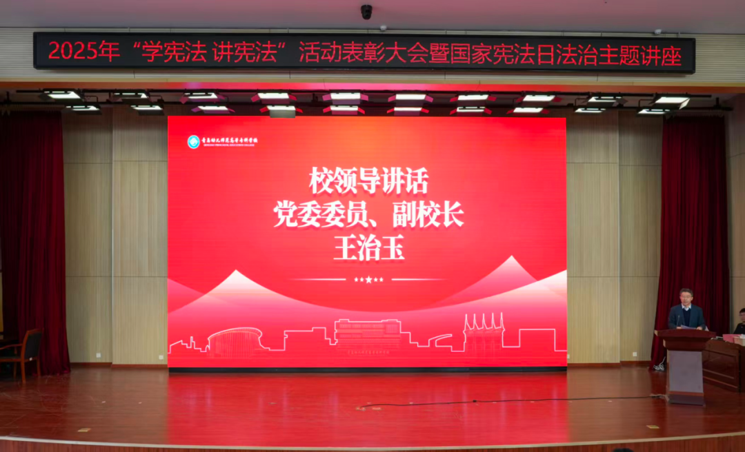 为大力弘扬宪法精神,切实增强全校师生的法治意识和法治素养,12月4日,在第十二个国家宪法日来临之际,2025年“学宪法 讲宪法”活动表彰大会暨国家宪法日法治主题讲座在学术报告厅举行。学校党委委员、副校长王治玉,胶州市人民检察院检察官徐冰心,相关处室负责同志、法律顾问小组成员、全体辅导员及学生代表参加活动。