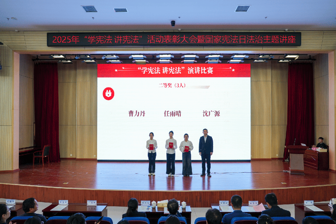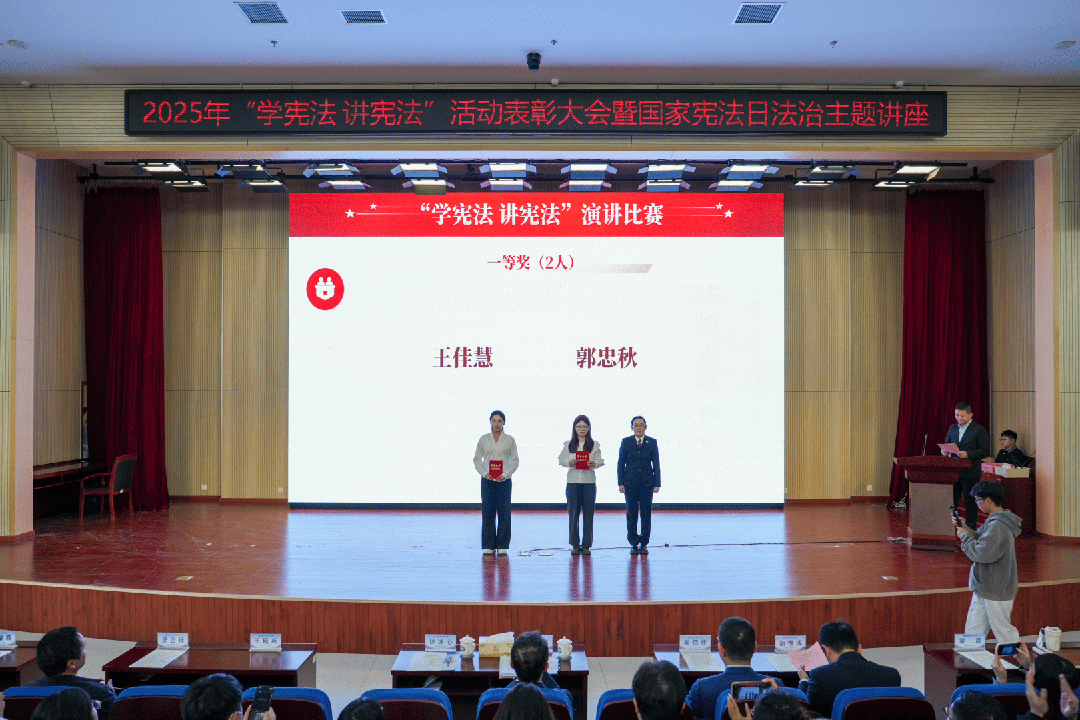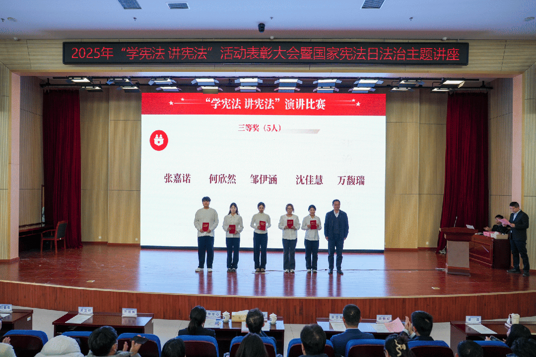 团委书记胡惟成宣读学校2025年“学宪法 讲宪法”活动表彰决定,对在法治素养竞赛、演讲比赛中表现优异的学生予以表彰。
