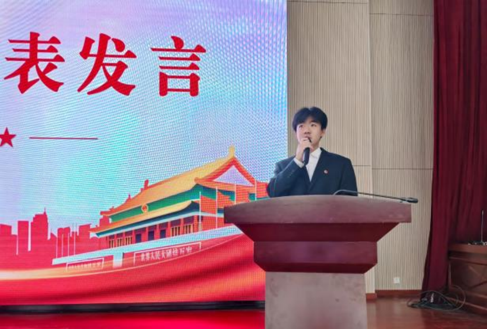 信息学院2024级信息安全技术应用2班闫福曈、外国语学院2024级商务英语1班王佳伟作为新、老团员代表发言。他们号召全体团员共同学习、互相激励,在志愿服务、社会实践、学风建设中走在前列,让团旗在青春奋斗的足迹中更加鲜艳,让团徽不只戴在胸前,更刻在心里。
