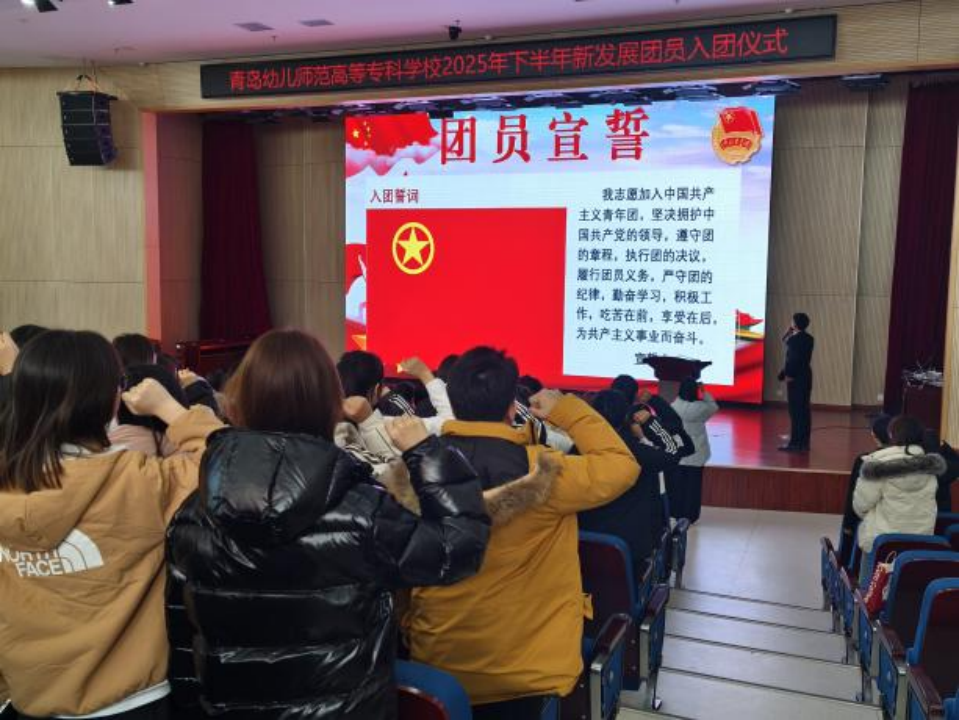 为传承红色基因、强化团员意识,引领广大青年坚定跟党走、奋进新征程,在“一二·九”运动九十周年纪念日来临之际,青岛幼儿师范高等专科学校2025年下半年新发展团员入团仪式在尚德楼学术报告厅庄严举行。各学院新发展团员及青年代表共同参与,在历史与现实的交汇中,重温青春誓言,汲取前行力量。