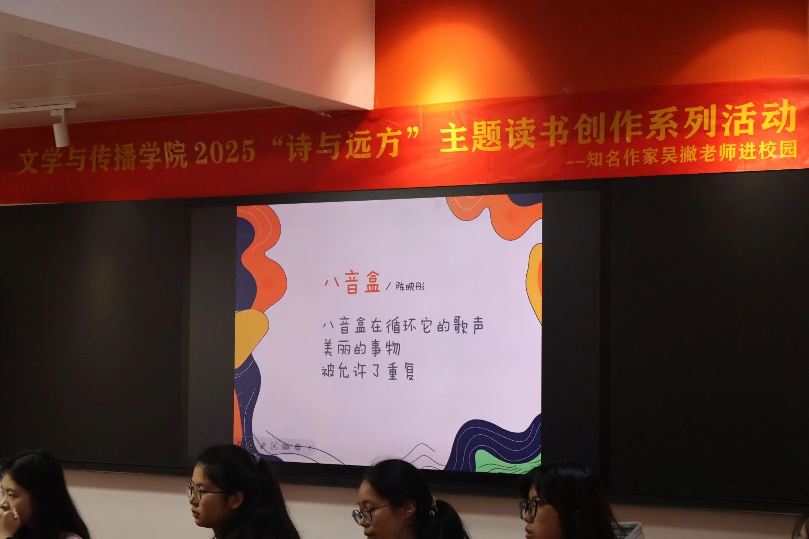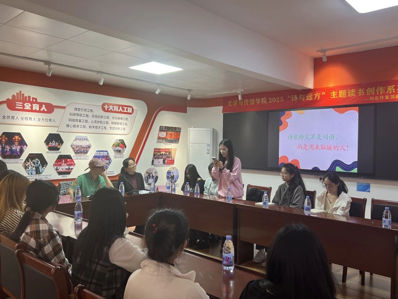 为传承文学经典,激发青年学子创作灵感,4月25日下午,文学与传播学院在C区文明实践中心举办“诗与远方”主题读书创作活动,邀请知名作家吴撇老师带来一场别开生面的文学分享会。