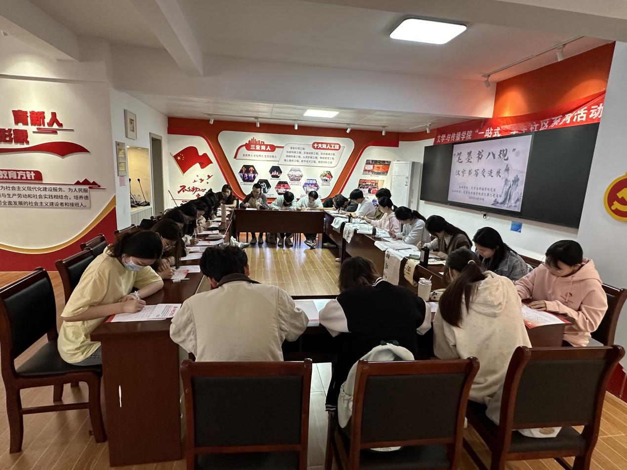 为进一步深入贯彻中央八项规定精神学习教育,强化支部党员廉洁自律意识。2025年4月24日,在学生公寓C区社区新时代文明实践站,文学与传播学院学生第三党支部开展“笔墨守八规”汉字书写交流展。本次活动以书法艺术为载体,将理论学习与传统文化相结合,引导青年党员学深悟透中央八项规定精神,厚植崇廉尚俭的校园文化氛围。
