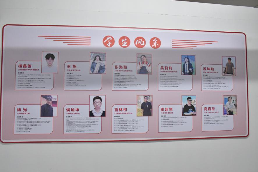 学院学生社区改造以打造特色鲜明的党建文化阵地作为核心,让红色文化深度融入学生日常生活,强化思想引领,增强使命感与责任感,筑牢学生成长成才的思想根基。学生风采展示平台一面精心打造的 “学生风采墙”格外引人注目,十余位优秀学子的照片与荣誉事迹整齐陈列,成为社区最亮眼的“荣誉墙”。