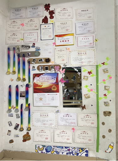 宿舍注重文化建设,共同布置了“荣誉墙”与“出入牌”,荣誉墙展示着大家获得的各类奖状与证书,出入牌则印刻着宿舍专属口号,彰显独特风貌;定期开展“读书日、电影夜、运动日”等特色活动,读书日共享好书感悟,电影夜共品经典影片,运动日结伴开展体育活动。在校园活动中,他们也曾获评“学霸宿舍”“文明宿舍”,荣获院宿舍装扮大赛一等奖,参与志愿服务累计1000小时。